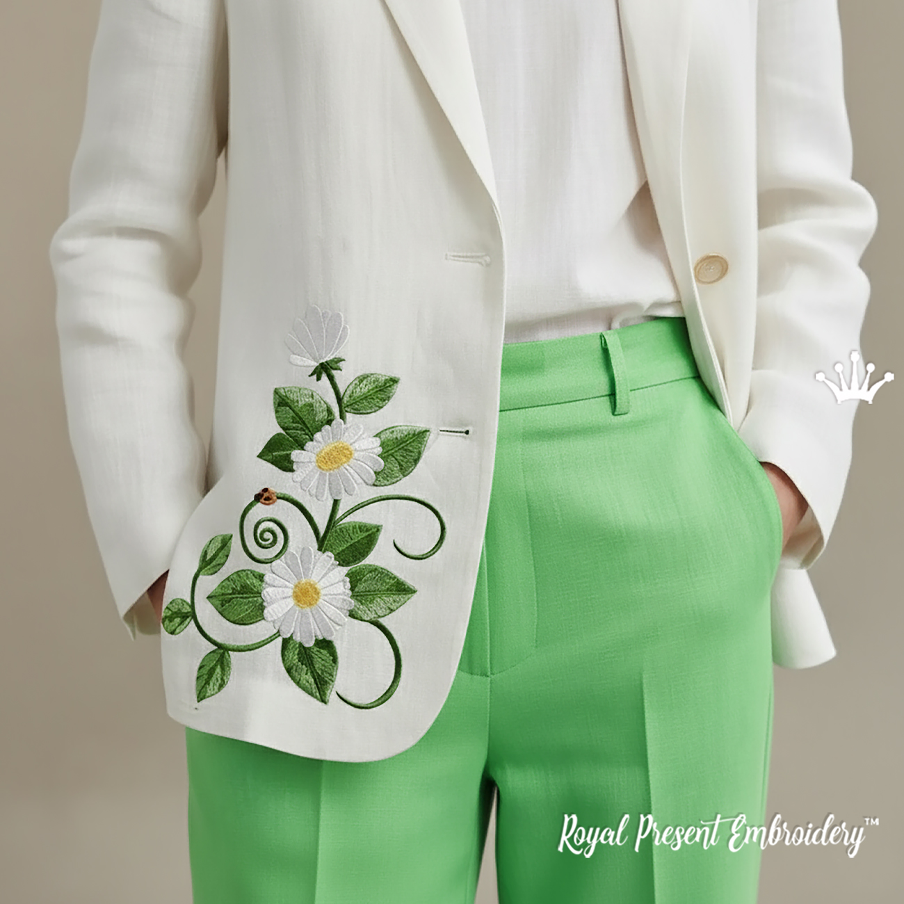 A delicate corner embroidery design featuring daisies and a ladybug, perfect for decorating linen blazers, jackets, blouses, and home textiles. The embroidery looks light, elegant, and enhances the individuality of any garment.