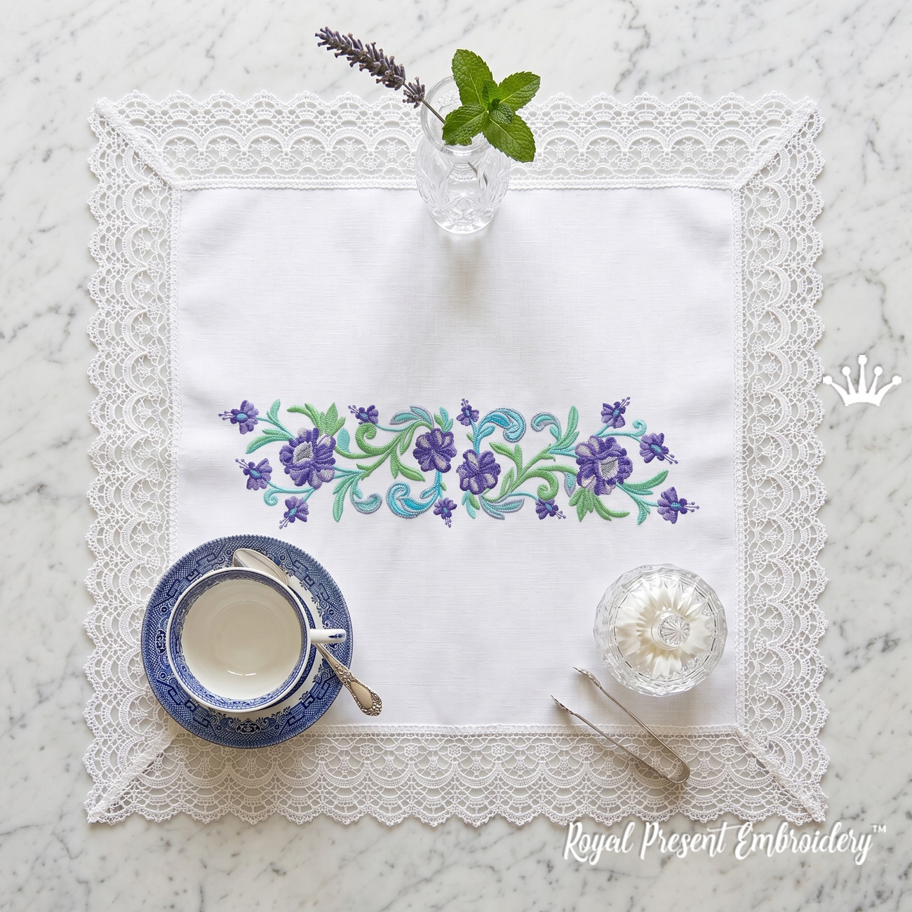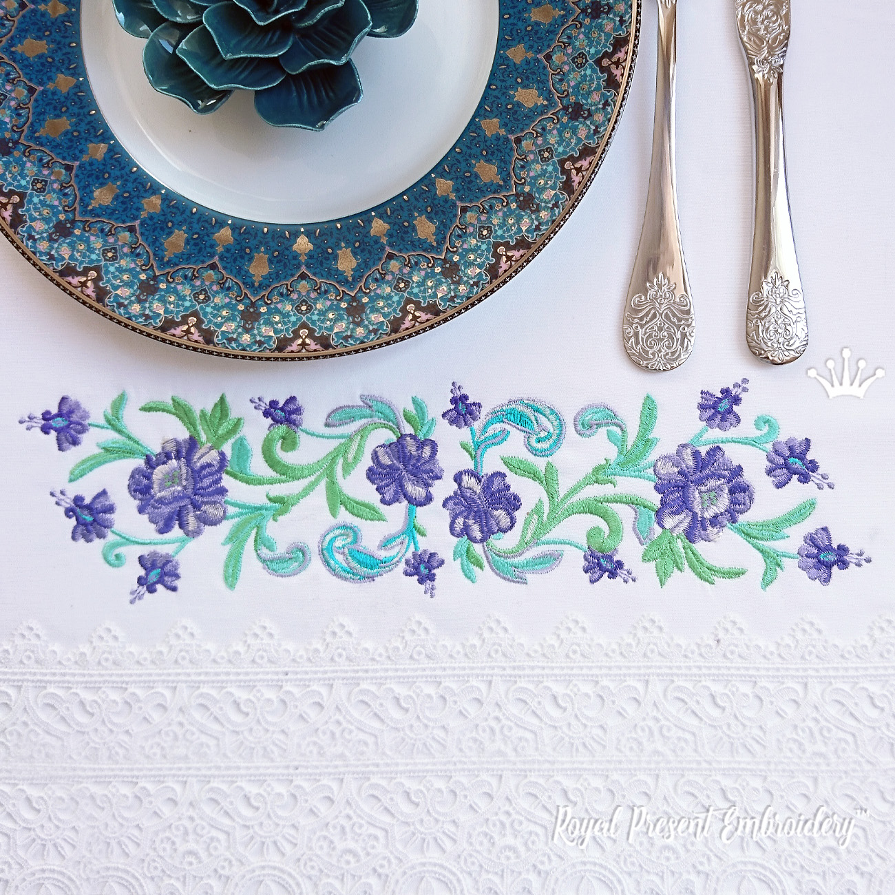 Emerald Bloom Floral Border Machine Embroidery Design is a graceful decorative border with violet flowers and flowing emerald scrolls. Perfect for pillows, table linens, towels, placemats, and elegant home decor projects.