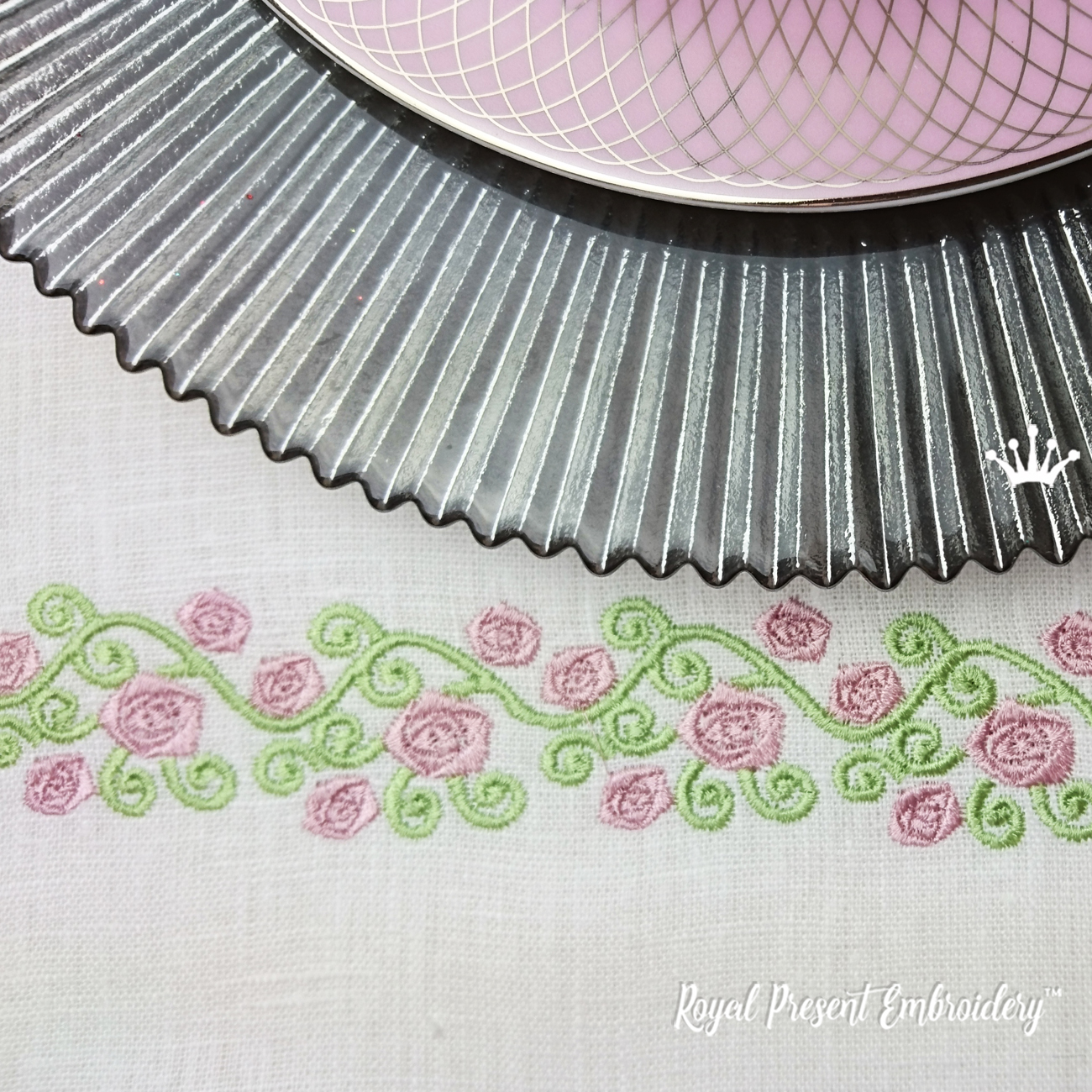 Thin Pink Roses Border is a machine embroidery design provided as a digital file, created for delicate and elegant decorative projects. This refined border features soft pink roses combined with graceful vine elements, forming a light and harmonious floral pattern. The design is well suited for embroiderers who appreciate subtle decoration and balanced ornamentation in their work. It works beautifully in projects where a gentle accent is needed rather than a bold focal point.