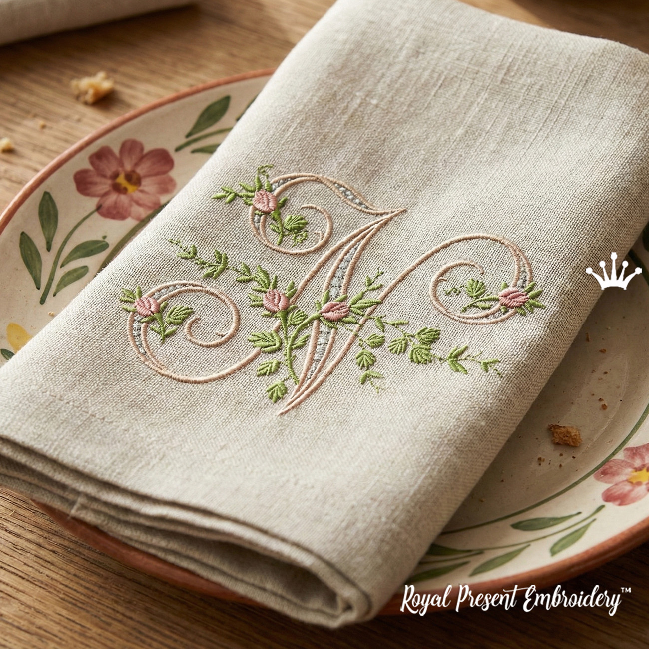 Elegant vintage floral monogram featuring the letter N adorned with beautifully detailed roses and decorative foliage. This refined composition adds sophistication and charm to any personalized embroidery project, making it perfect for weddings and luxury home textiles.