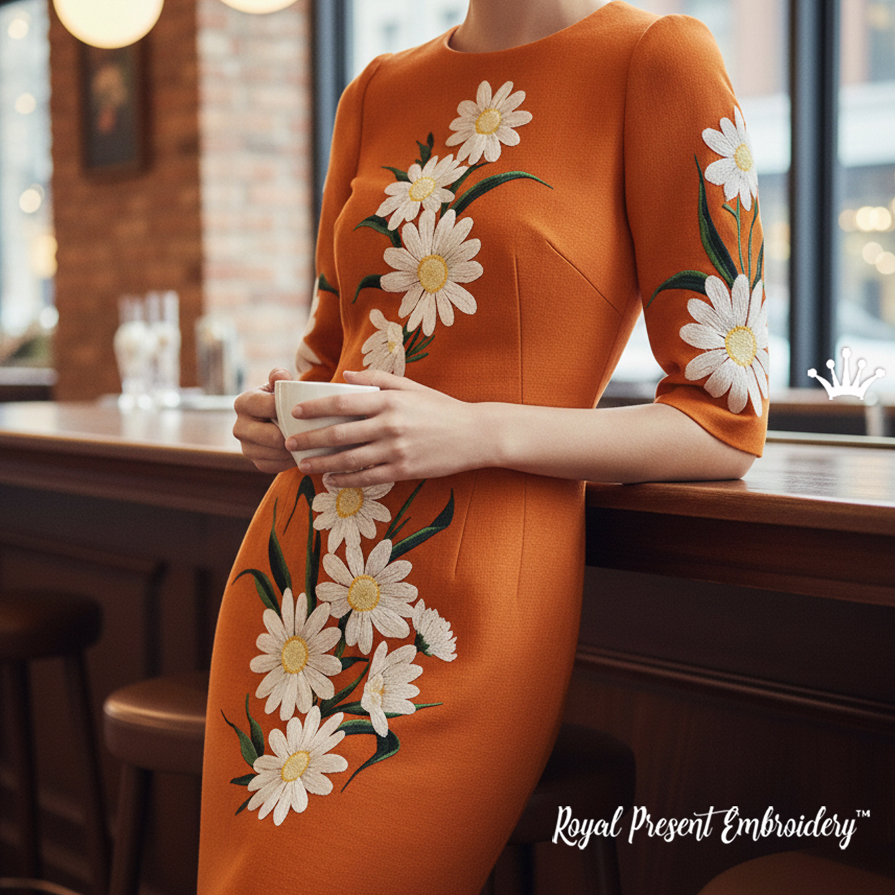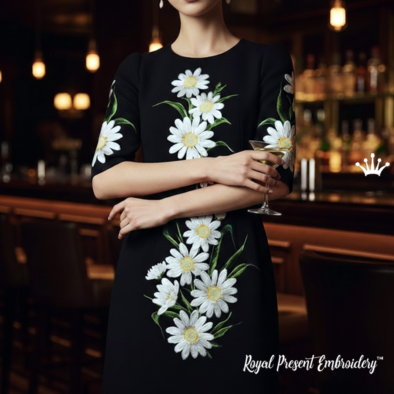 An elegant set of machine embroidery designs featuring white daisies for decorating dresses, blouses, and evening garments. Multiple elements allow you to create a balanced and harmonious composition on your project.