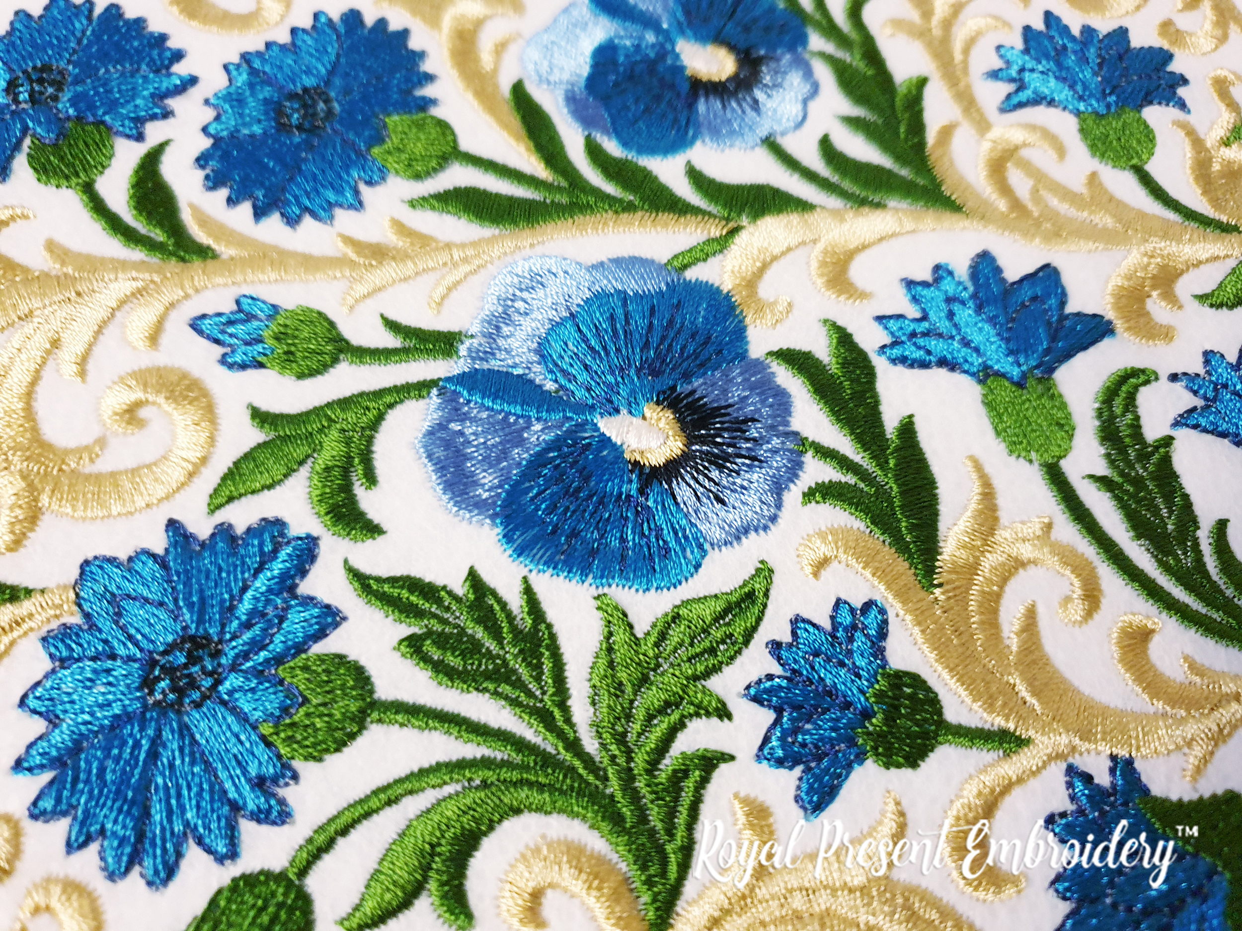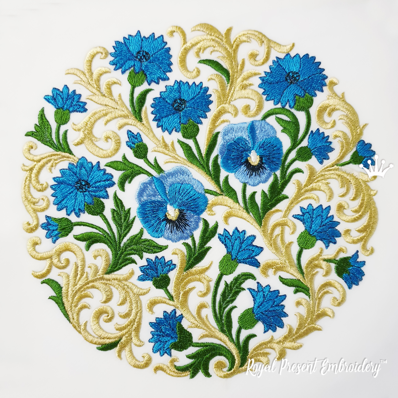 An elegant machine embroidery design in baroque style with rich golden scrolls and vibrant cornflowers. This ornate circular pattern is perfect for classic decor projects.