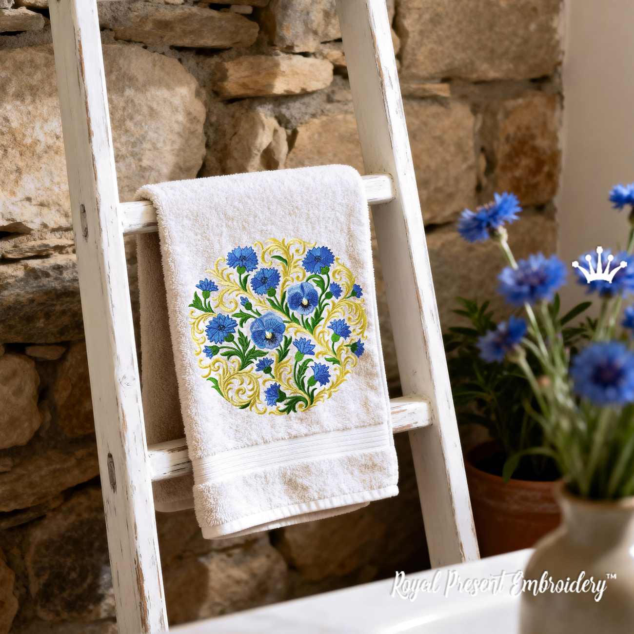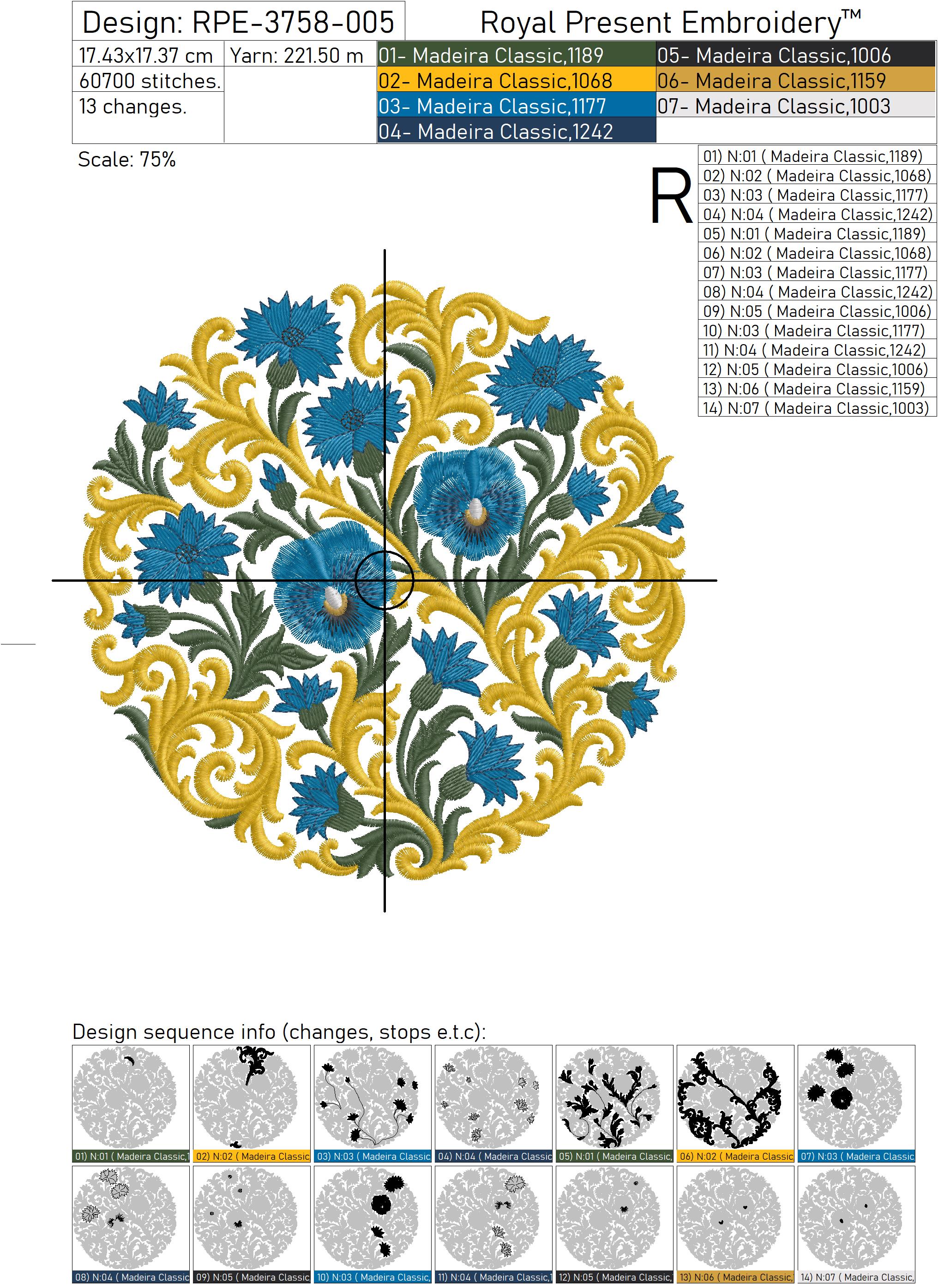 Baroque cornflowers circle machine embroidery design — ideal for smaller projects while keeping a unified decorative theme.