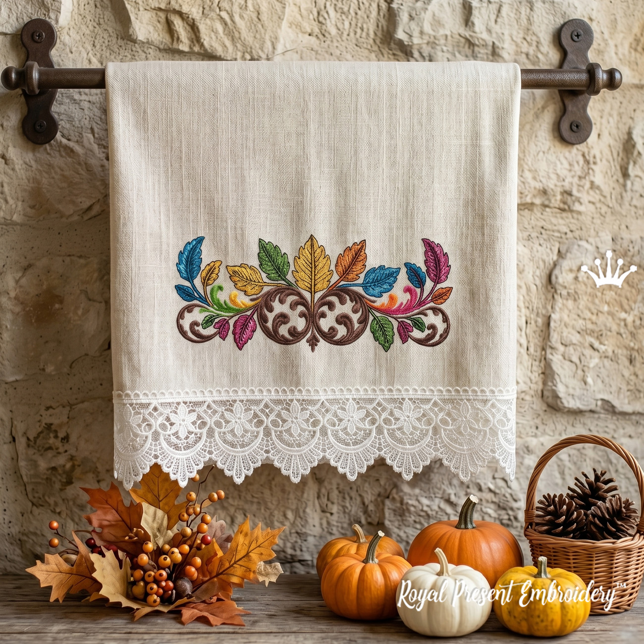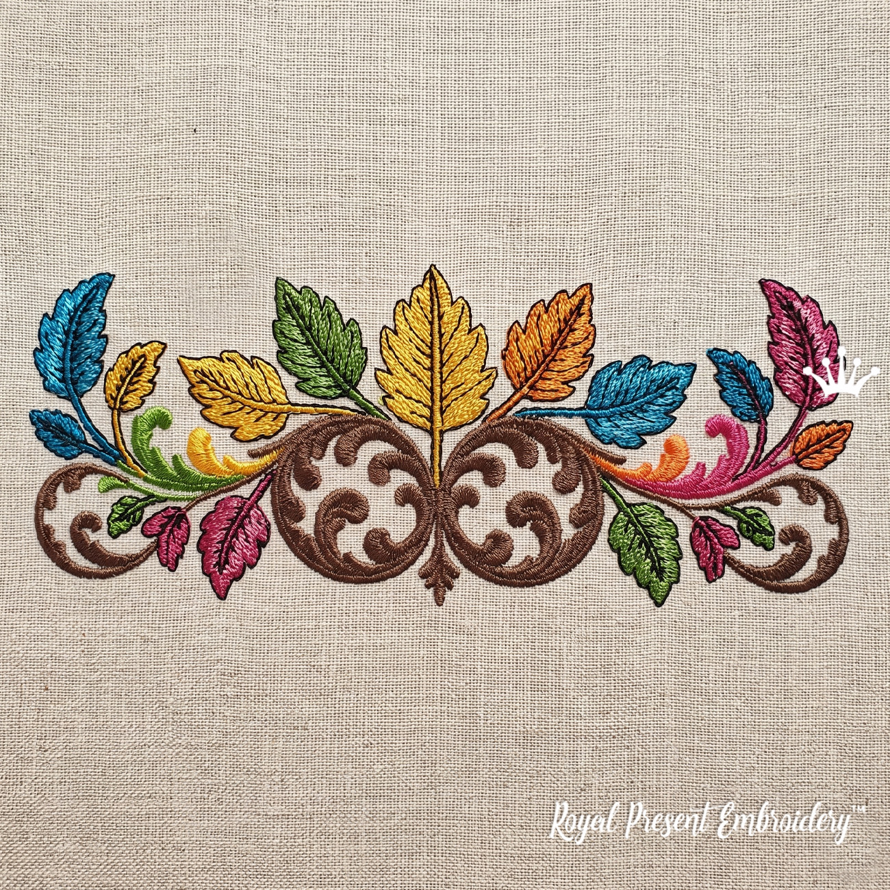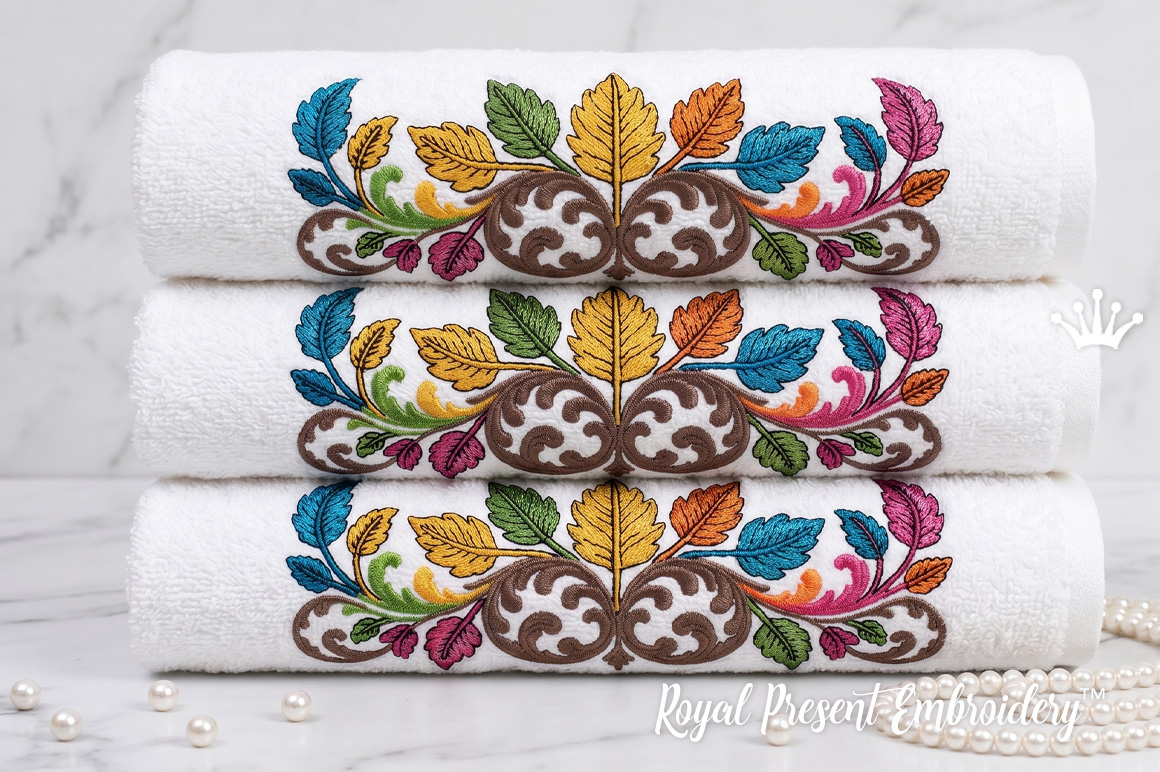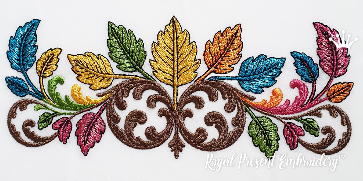 This machine embroidery design is ideal for anyone looking for a colorful leaf border, autumn embroidery border, baroque foliage ornament, decorative scroll border, fall leaves embroidery, elegant border embroidery, or ornamental machine embroidery design for clothing and home decor.