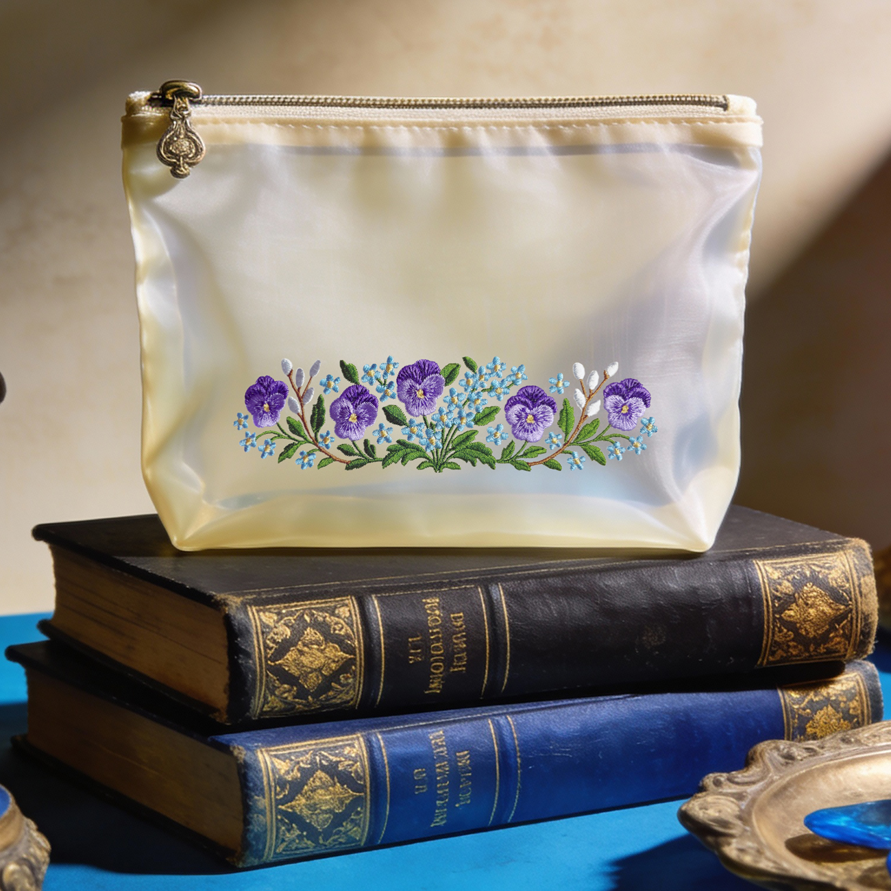 This design has a matching companion: Baroque Border with Pansies and Forget-Me-Nots Machine Embroidery Design. Using both designs together allows you to create coordinated textile sets with a unified floral theme.