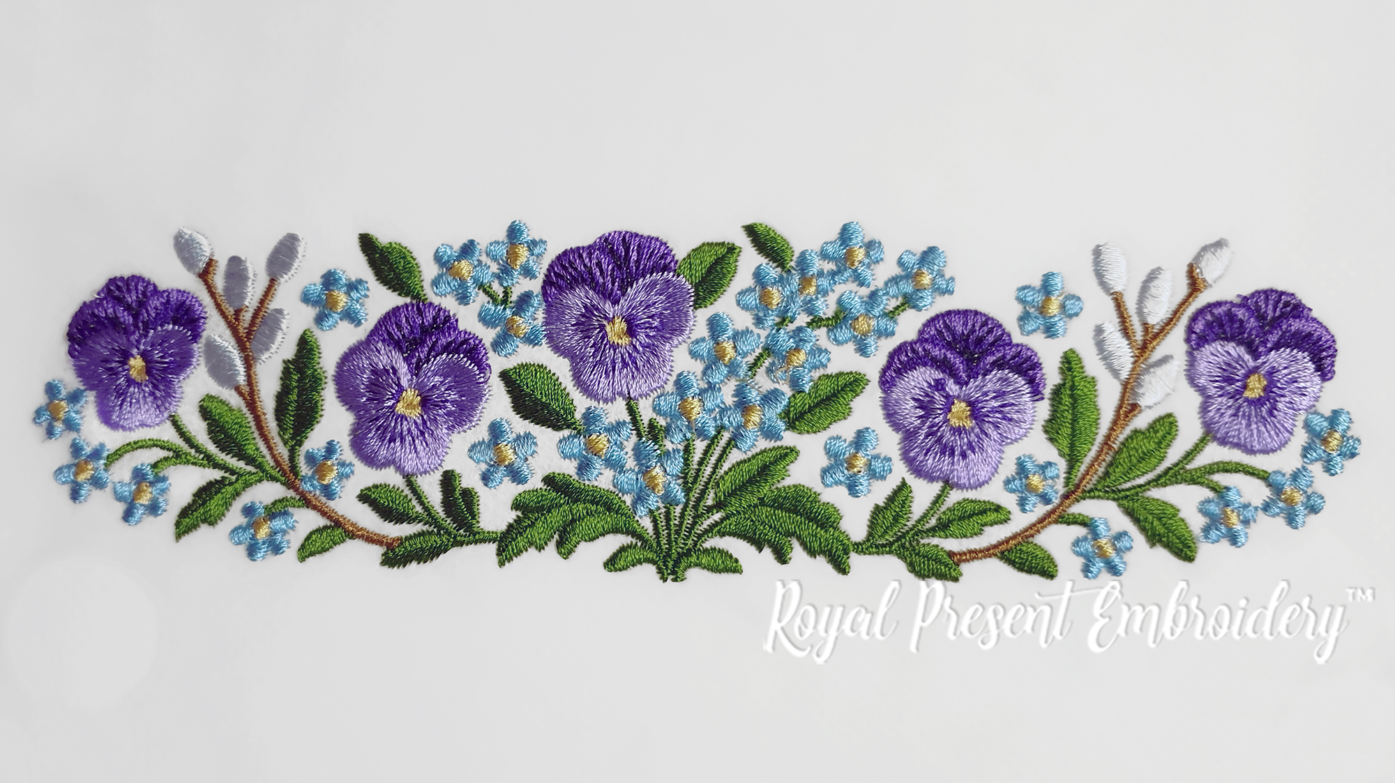 Border with Pansies and Forget-Me-Nots machine embroidery design provided as a digital file. The border features a delicate floral composition with pansies, forget-me-nots, and spring pussy willow branches, creating a light, fresh, and elegant seasonal look. This design is suitable for embroiderers who value detailed florals and refined decorative borders for textile projects.