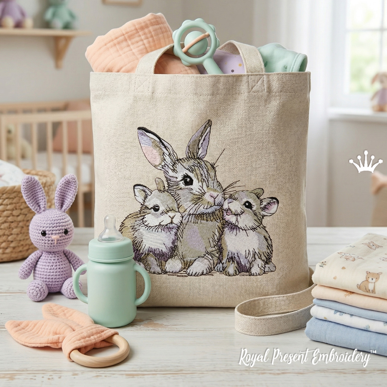 You can embroider this design on baby bags, nursery organizers, decorative pillows, quilts, blankets, towels, tote bags, children’s clothing, storage baskets, wall decor and many other textile items. It is a lovely choice for baby gifts, nursery decoration, Easter projects and handmade family keepsakes.