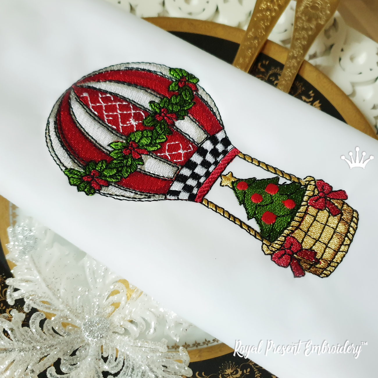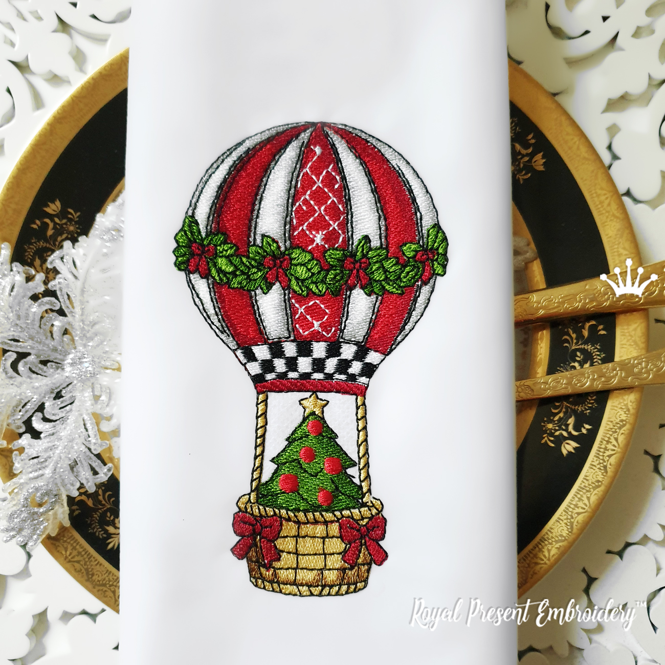 Bring festive charm to your holiday stitching with the Christmas Balloon with Christmas Tree — a delightful machine embroidery design in vintage Christmas style. This whimsical scene features a red and white striped hot air balloon decorated with holly and bows, gently lifting a festive Christmas tree in a woven basket. The balance of classic ornamentation and joyful holiday spirit makes this design a standout for seasonal decor and gifts.
