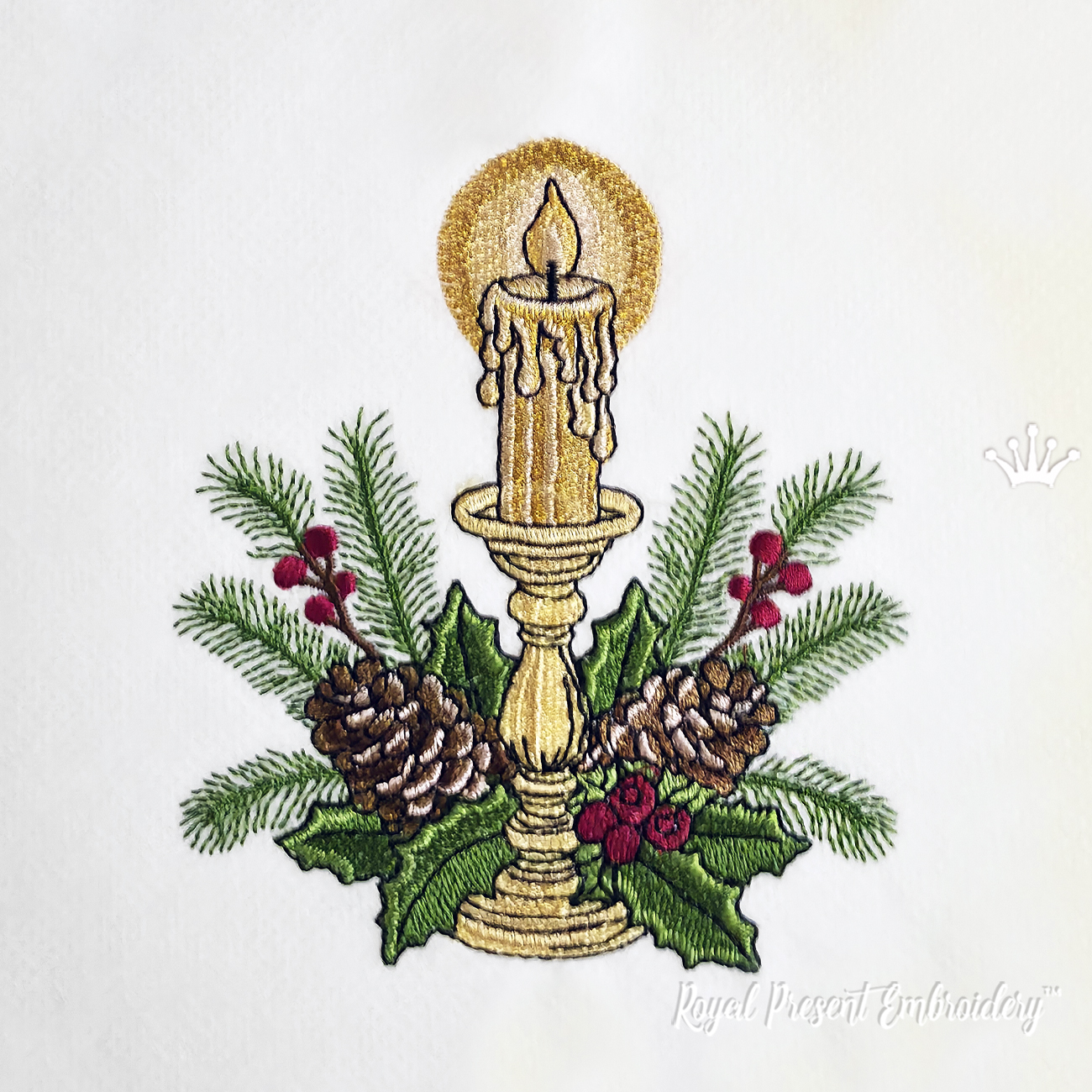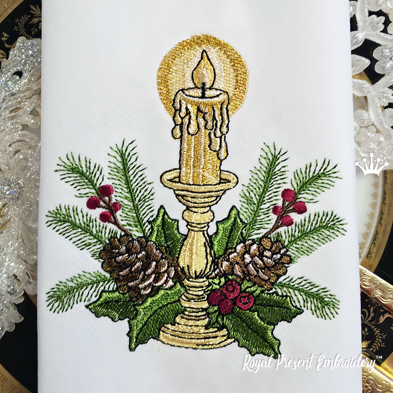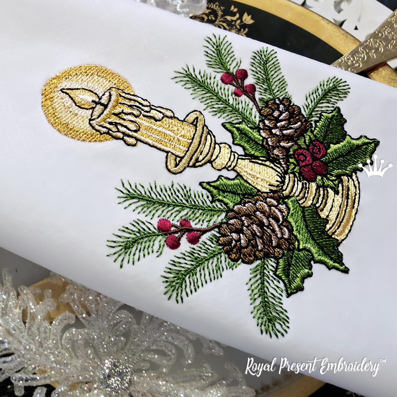 This elegant machine embroidery design features a glowing Christmas candle surrounded by lush pine sprigs, holly leaves, and bright red berries. The composition is created in a classic festive style, combining warm gold tones with rich greenery for a traditional holiday look. Detailed stitching and realistic textures make this design ideal for seasonal décor projects. It pairs beautifully with its companion piece, the Christmas Candle with Pinecones machine embroidery design, allowing you to create coordinated sets.