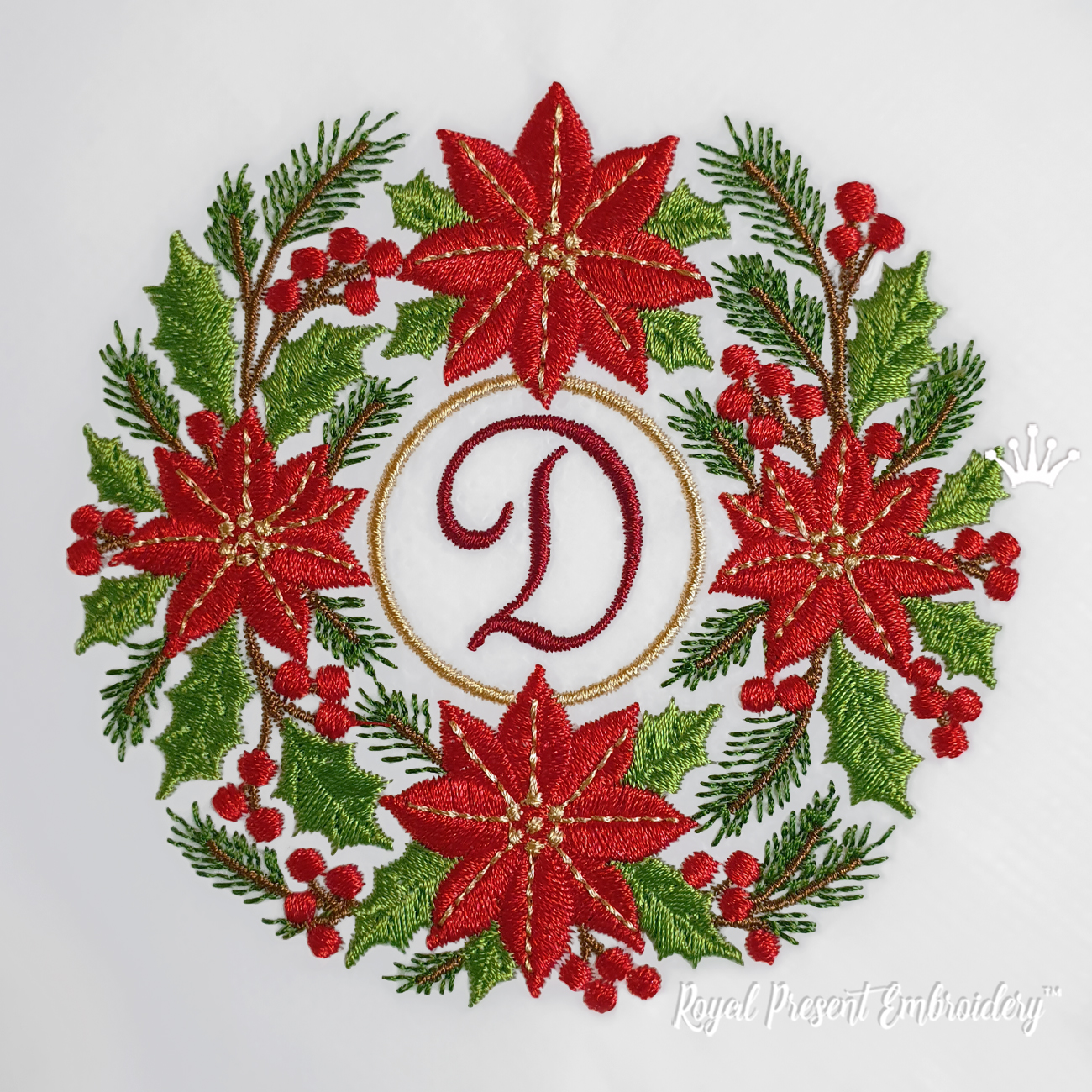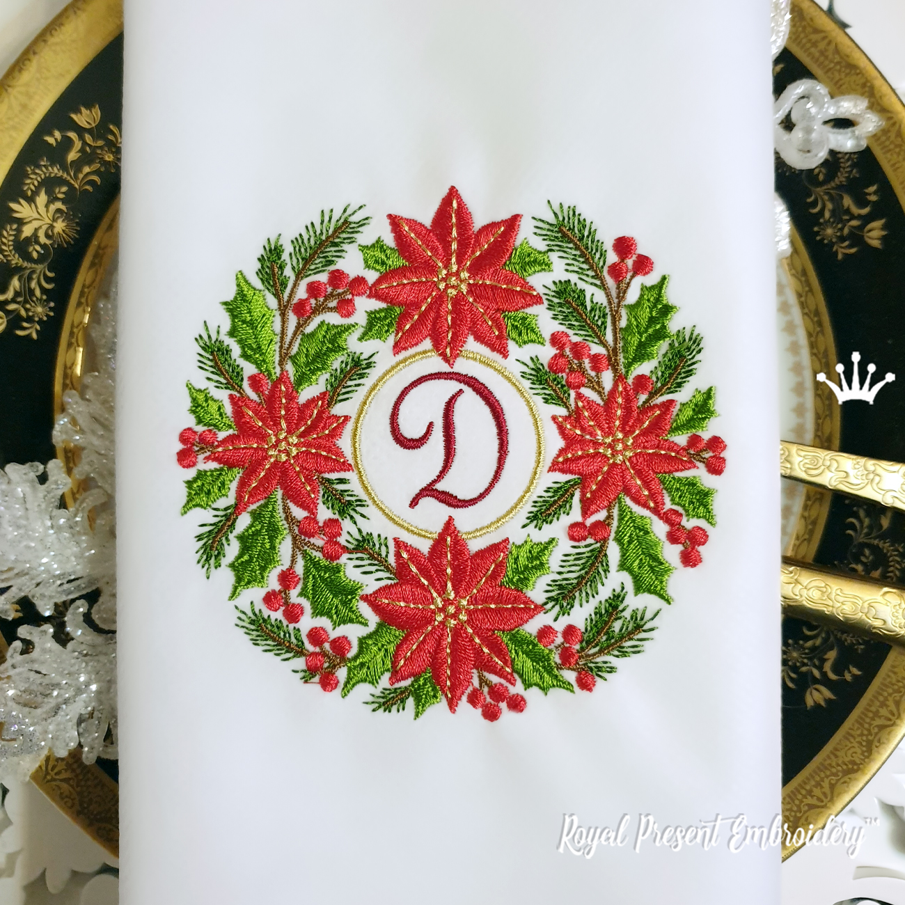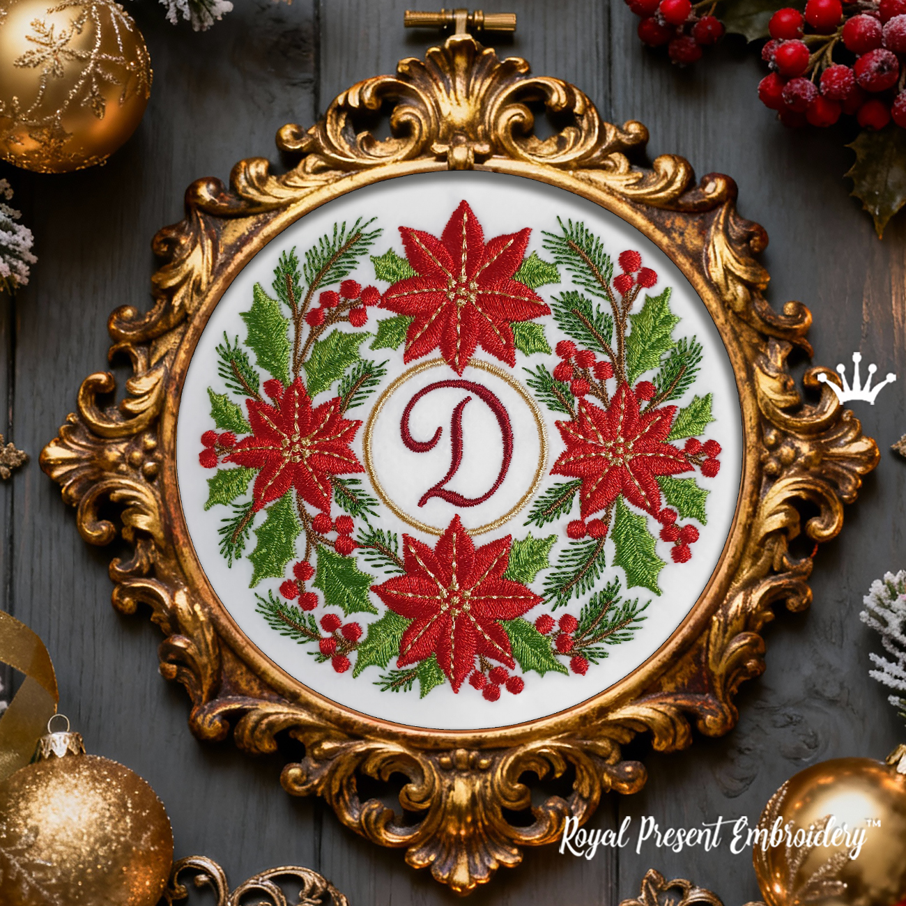 This elegant Christmas Poinsettia Frame Small machine embroidery design features a festive round frame adorned with classic red poinsettias, holly leaves, berries, and winter greenery. The composition is refined and balanced, making it perfect for adding a traditional Christmas accent to small projects. The style combines classic holiday elegance with a subtle vintage touch, ideal for seasonal décor and personalized gifts. A matching companion design, Christmas Poinsettia for Napkins small machine embroidery design, can be used to create coordinated holiday sets.