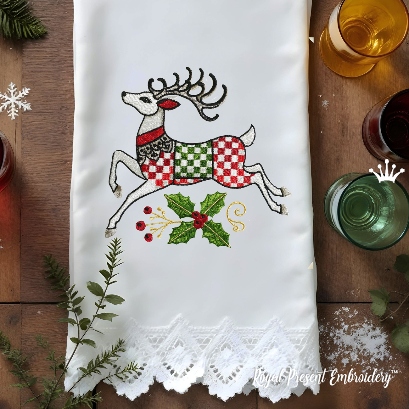 This machine embroidery design features a spirited Christmas reindeer with an eye-catching red and green checkerboard coat, elegant blackwork-style neck detail, and a festive holly branch below. Rendered in a bold and whimsical holiday style, it combines traditional holiday colors with a vintage flair, perfect for cozy seasonal décor or joyful handmade gifts.