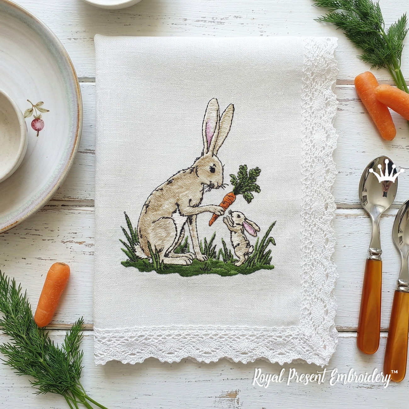 The mother bunny with her baby creates a warm storytelling composition that customers love when searching for Mother’s Day embroidery design, gift for mom embroidery, or family animal embroidery designs.
