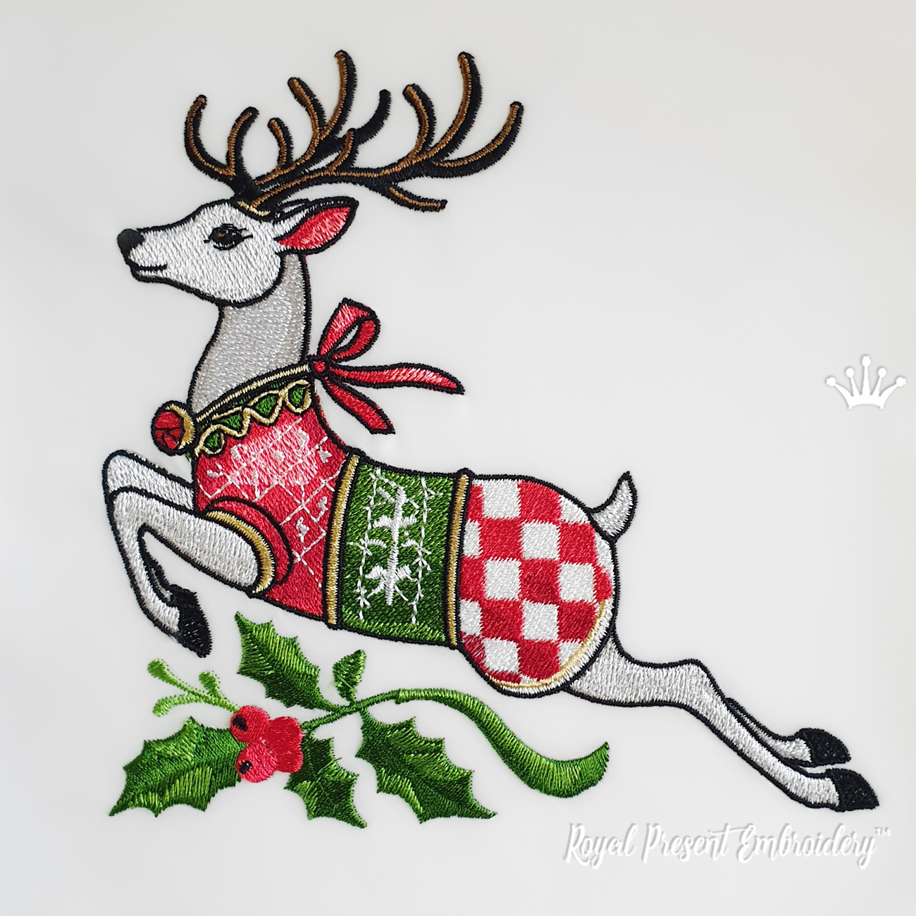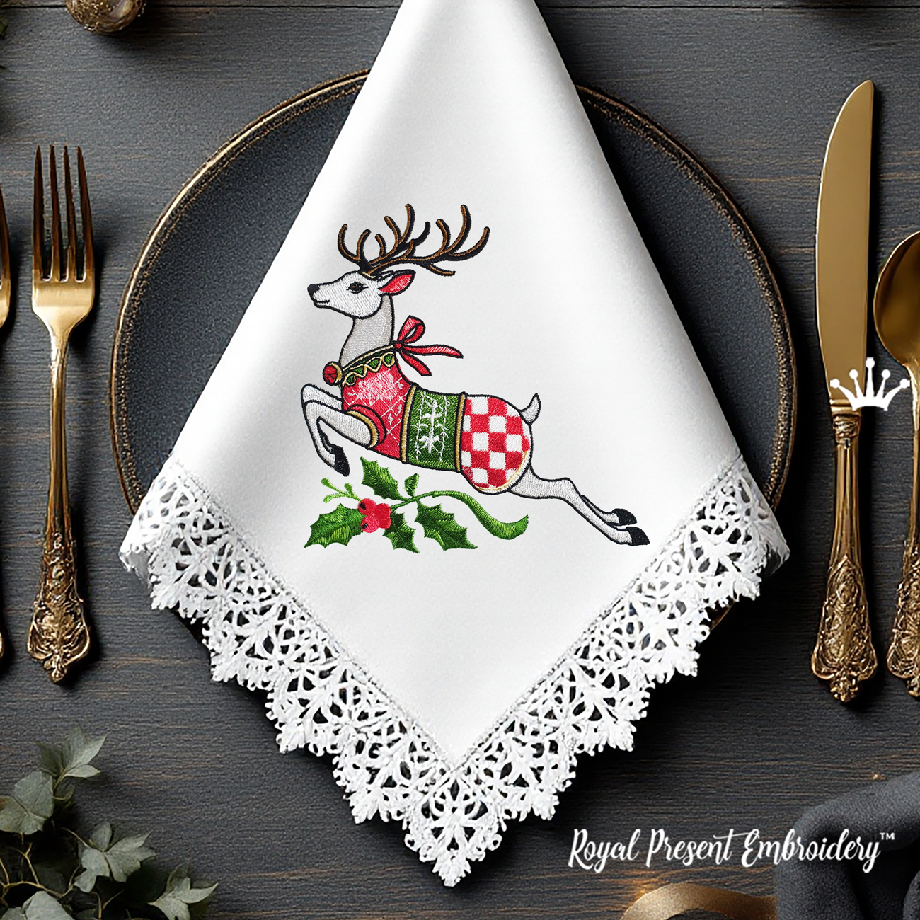 Deer with a bow and a checkered bell — a charming Christmas-themed machine embroidery design featuring festive textures and playful elegance. Perfect for decorating holiday towels, table linens, stockings, and home textiles. Instantly downloadable after purchase.