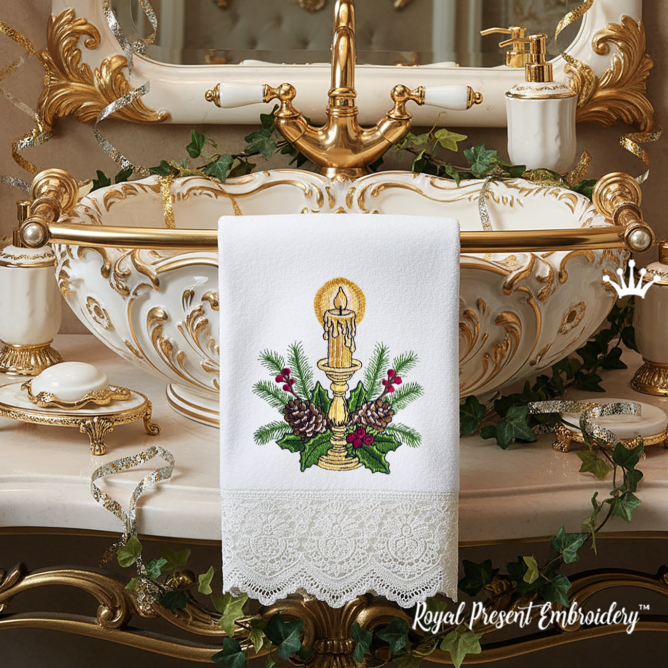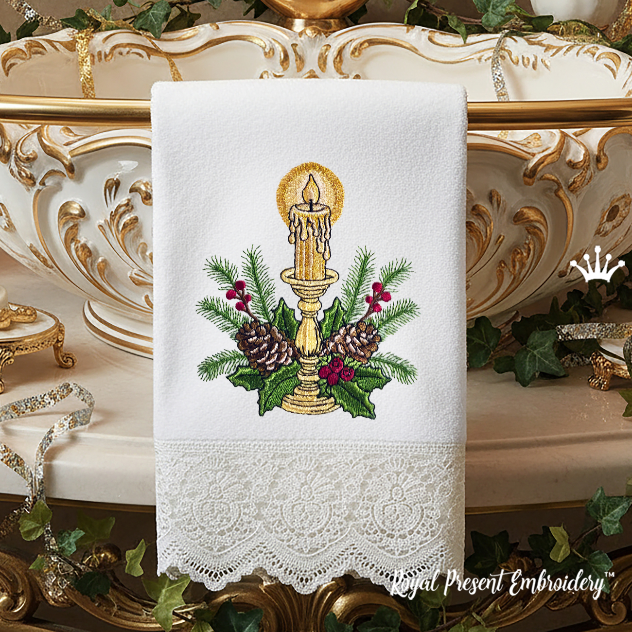 This elegant machine embroidery design features a glowing festive candle surrounded by detailed spruce branches and natural pine cones. Created in a classic Christmas style, it brings warmth, depth, and traditional holiday charm to any project. The realistic shading and precise stitching make this design stand out beautifully on seasonal textiles. It pairs perfectly with its companion piece, the Candle with fir branches and pine cones machine embroidery design, allowing you to create coordinated decorations or matching gift sets.