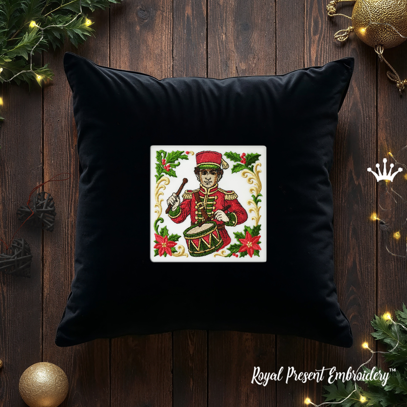 Bring a joyful rhythm to your holiday embroidery with the Festive Christmas Drummer machine embroidery design. Inspired by traditional Christmas motifs and part of the 12 Days of Christmas series, this elegant drummer boy is depicted in a classic red uniform, framed by holly leaves, golden scrolls, and festive poinsettias. Its vintage charm and detailed artistry make it a standout element in any seasonal project.