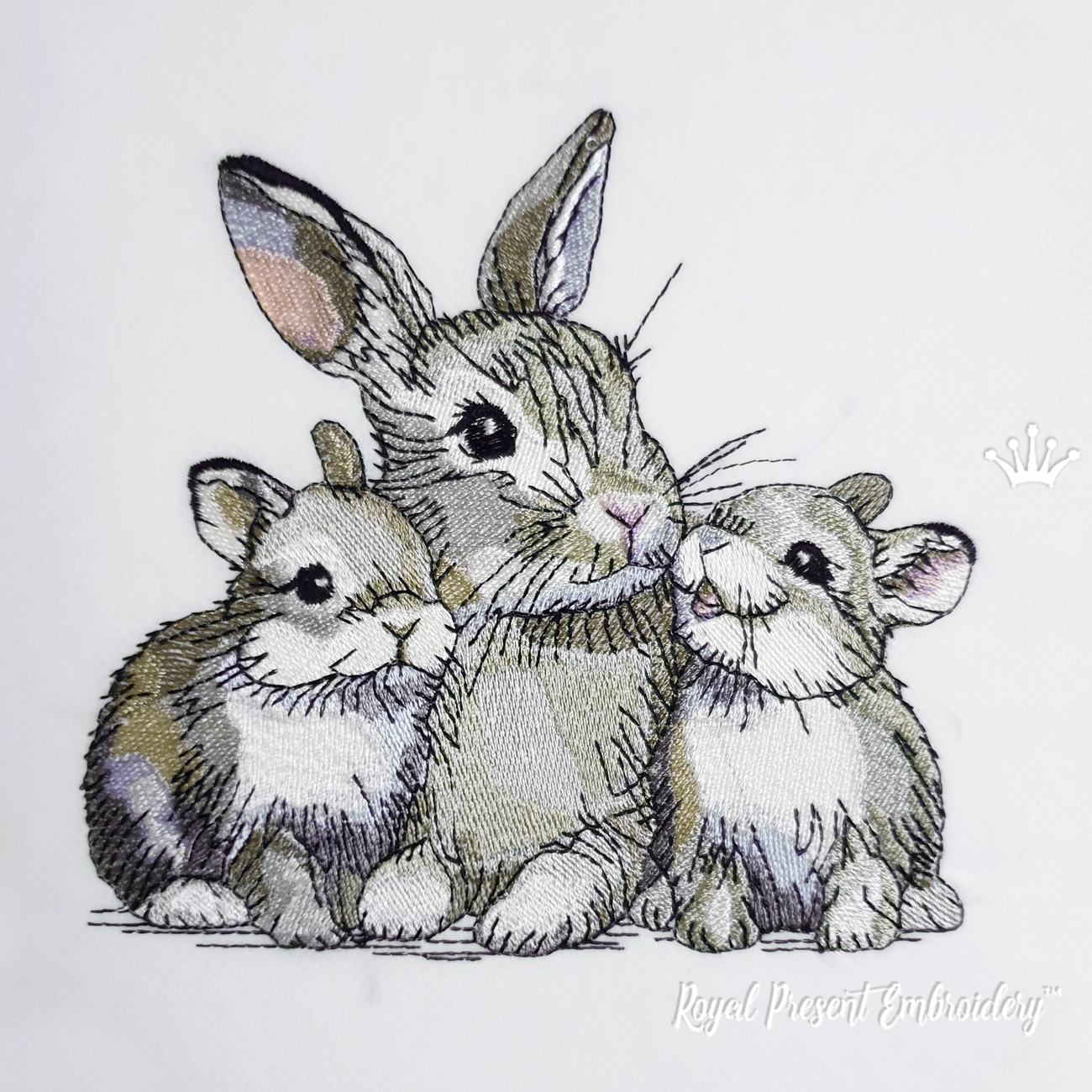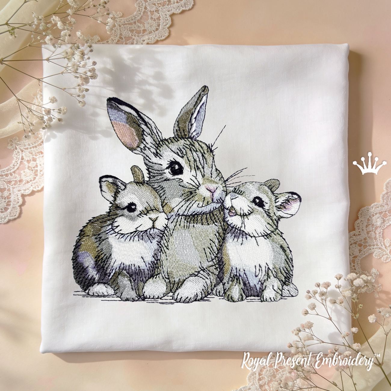A tender and heartwarming machine embroidery design Mama Bunny and the Bunnies is perfect for children’s items, blankets, pillows, towels, and newborn gifts. The sweet composition featuring a loving mother bunny and her little bunnies creates a feeling of warmth, care, and coziness. Carefully digitized, the design stitches out beautifully and looks wonderful on light and pastel fabrics.