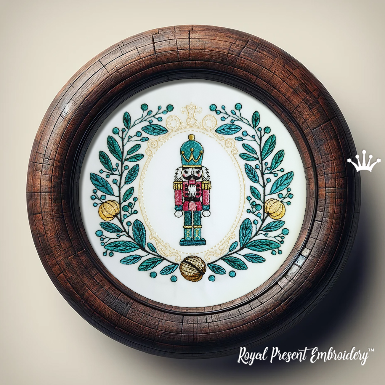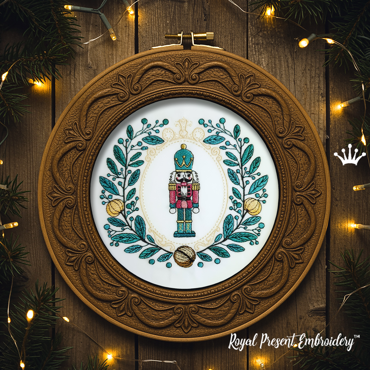This exquisite machine embroidery design showcases a classic Nutcracker figure framed in an ornate Baroque-style wreath of fir branches and golden ornaments. Combining the charm of vintage Christmas motifs with sophisticated detailing, this piece evokes warmth, tradition, and timeless elegance. Its refined linework and festive color scheme make it a standout addition to your holiday embroidery collection.