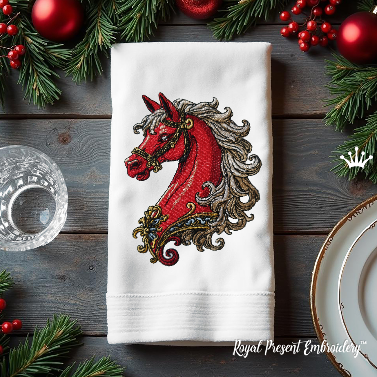 Enrich your textile creations with this striking machine embroidery design featuring a powerful red horse head in a luxurious baroque motif. Designed with classic elegance and vintage character, it’s perfect for themed décor, gifts, and more. A companion design titled Baroque Red Horse Head is also available.