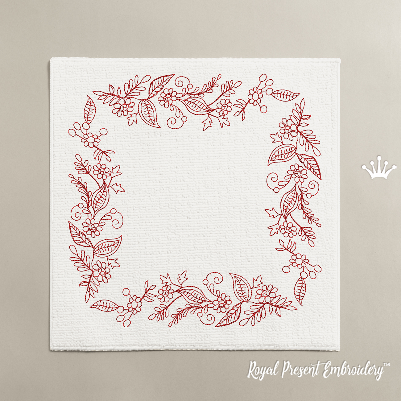Elevate your textile projects with the Red work leafy border machine embroidery design. This elegant motif features a continuous vine of leaves rendered in the classic red‑work style, offering a timeless, sophisticated look that blends well with vintage, Scandinavian, or minimalist décor. For a coordinated set, you might also explore the companion design in this series: the Red work floral corner design.
