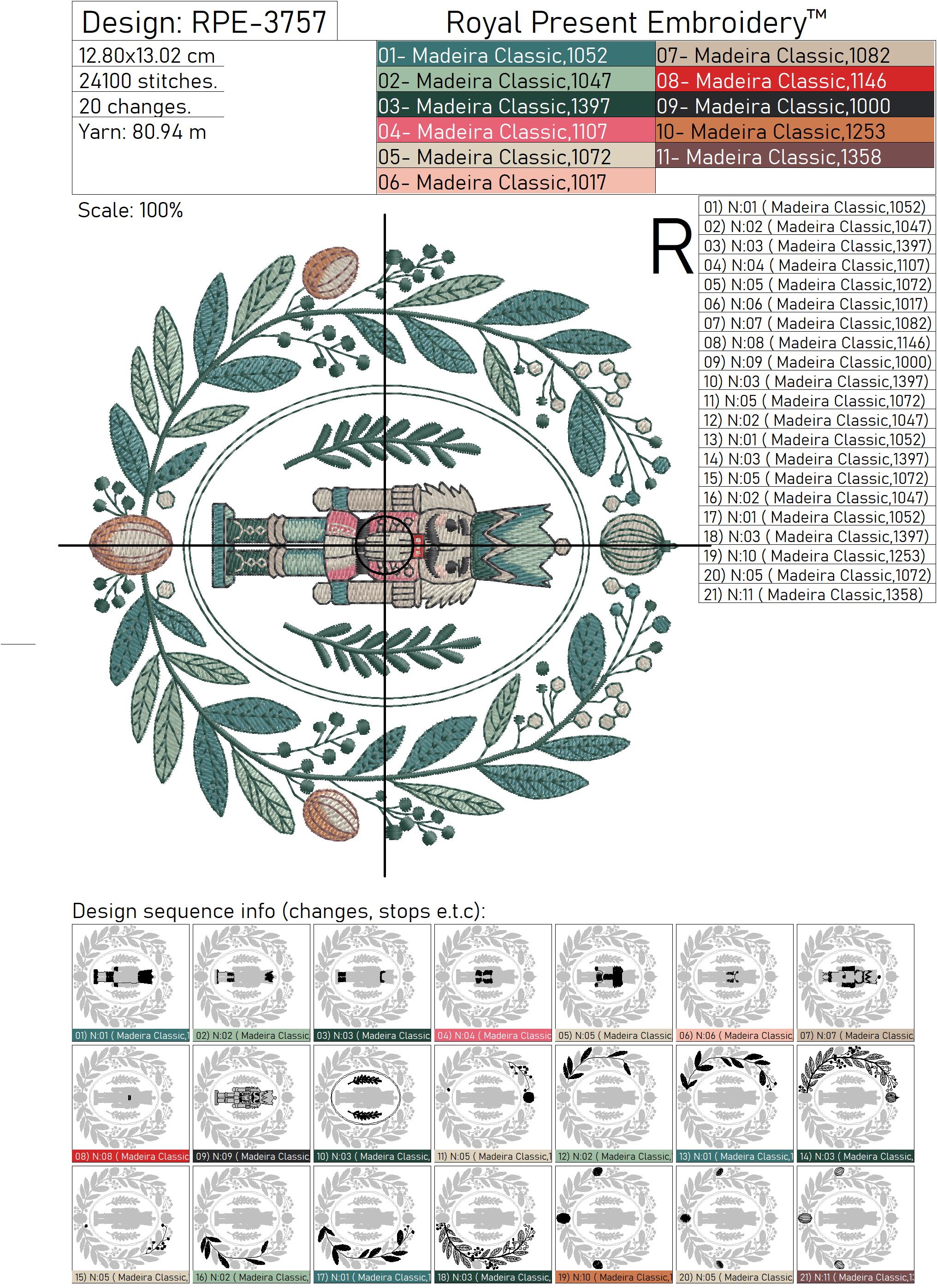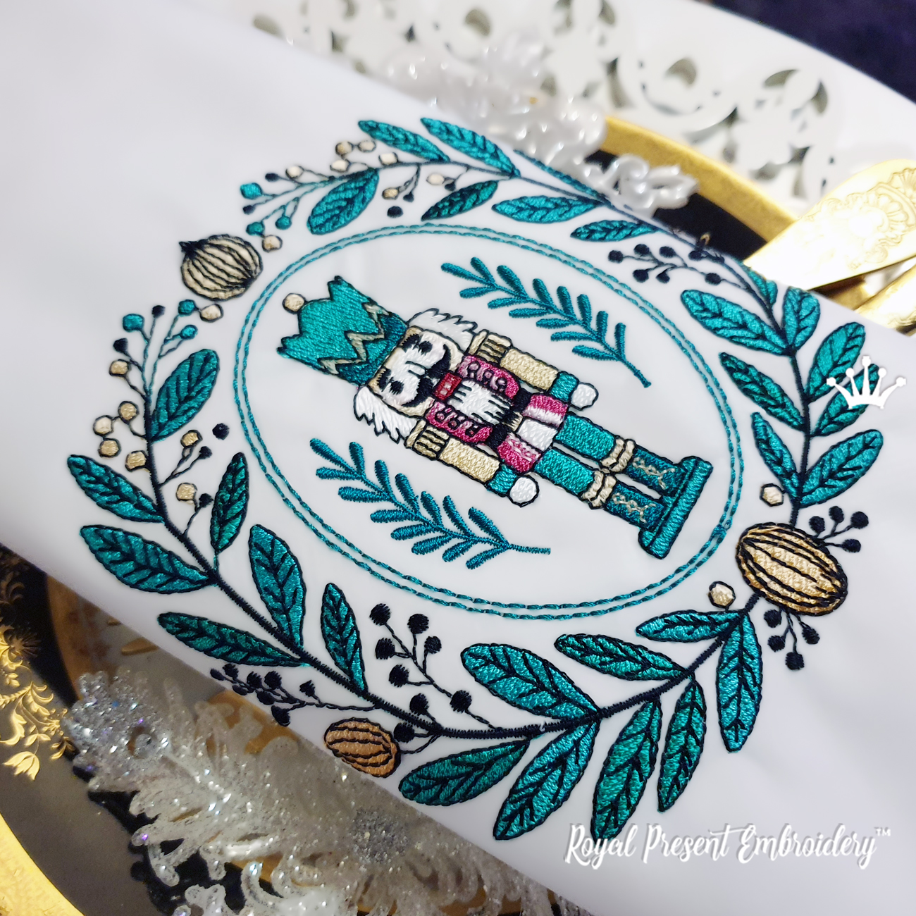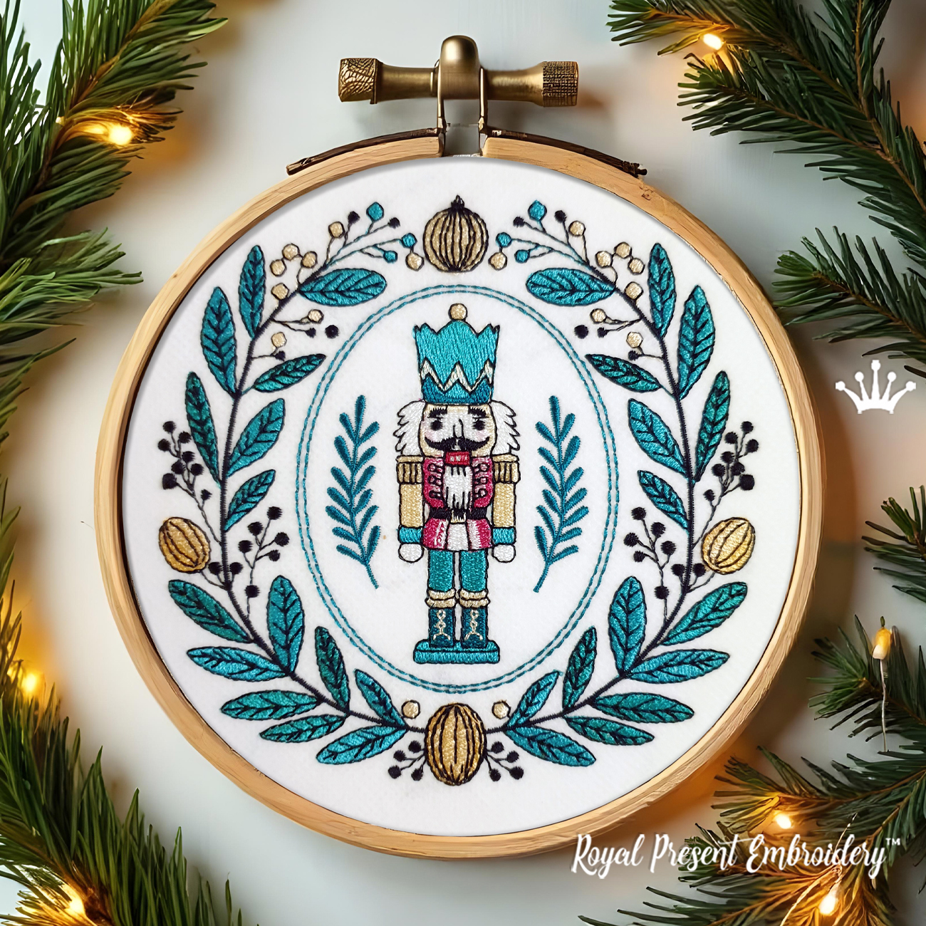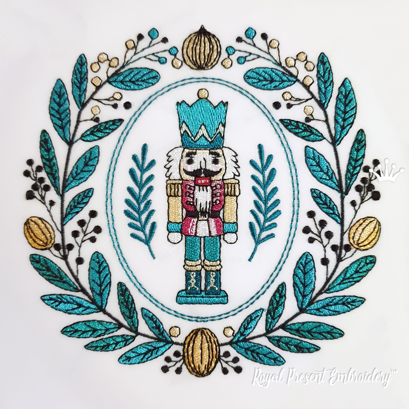 This charming machine embroidery design features a vintage-style Nutcracker soldier framed by a festive wreath of stylized leaves, berries, and golden ornaments. With a palette of rich teal, gold, red, and black, it captures a refined yet whimsical Christmas spirit, perfect for those who love classic holiday motifs with a touch of old-world elegance.