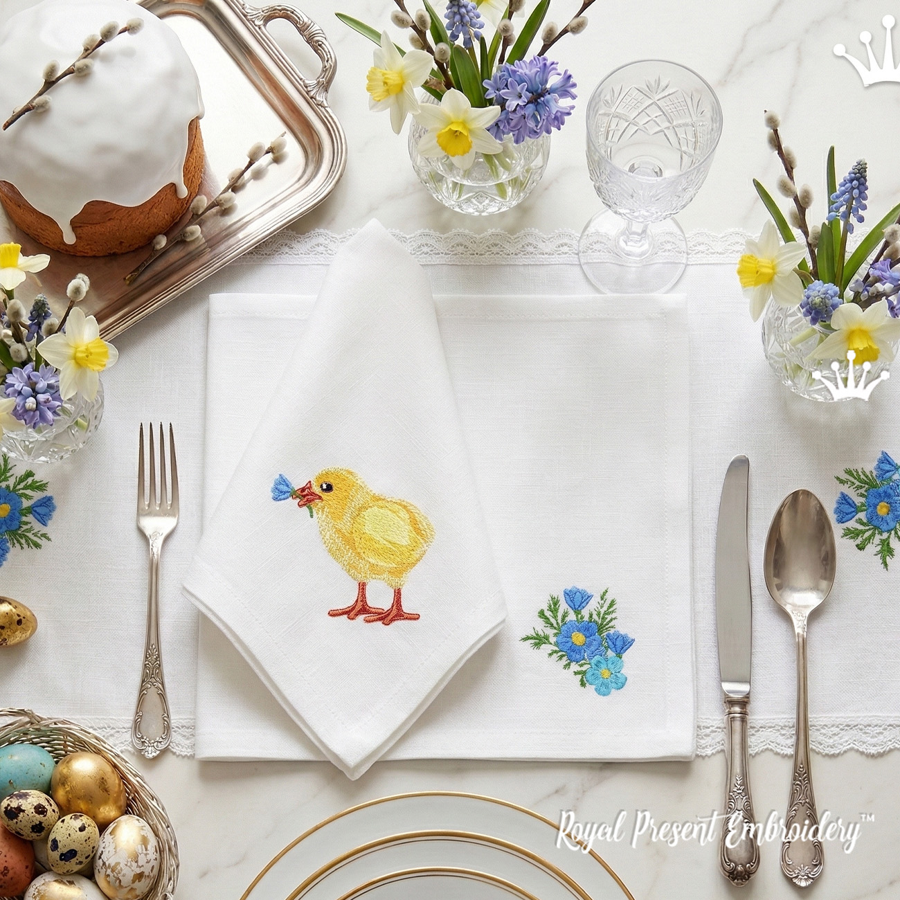 While the Forget-Me-Not Duo offers a splash of blue, the Easter Chicken with primrose version adds a touch of classic white elegance. Combining these two companions allows you to create a professional, coordinated set of holiday linens that look like a boutique collection.