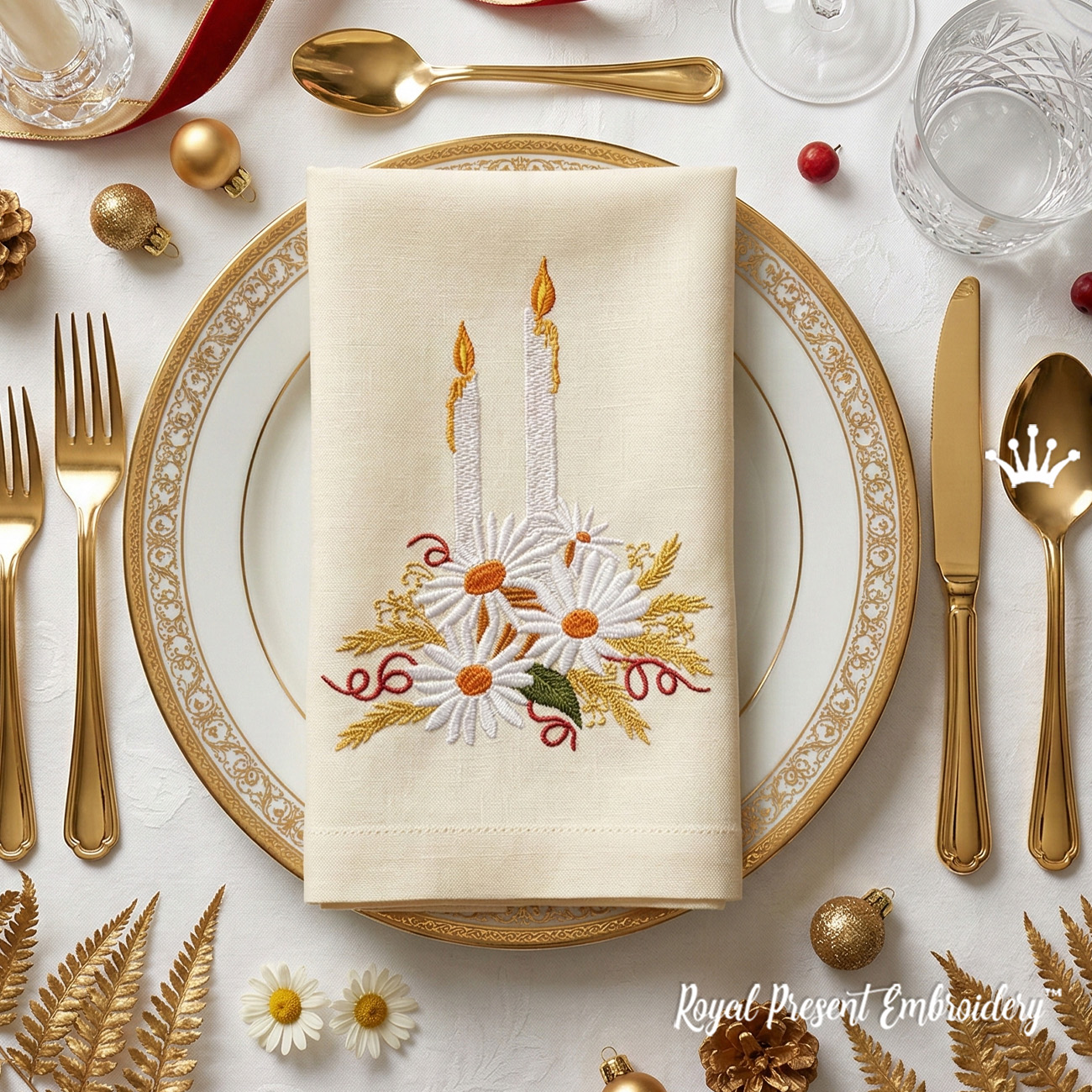 The "Christmas Daisy Candle Glow" machine embroidery design is a festive yet elegant depiction of two tall glowing candles surrounded by a delicate arrangement of daisies and greenery. The soft white petals of the daisies contrast beautifully with the vibrant red and green accents, creating a harmonious balance of light and color. This design evokes a sense of peaceful holiday warmth, perfect for those who want to bring a touch of natural beauty into their holiday decor.