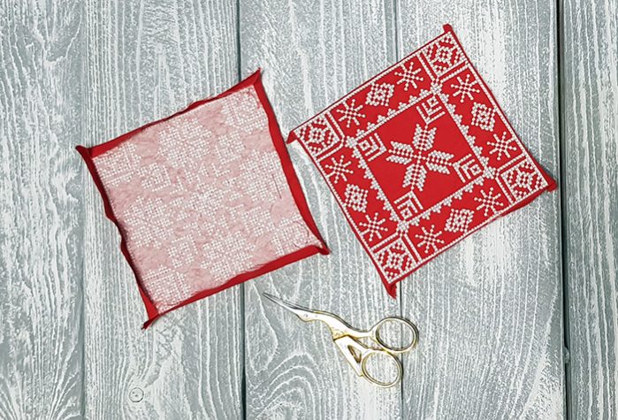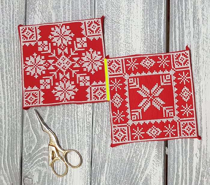 1. Now then take two ornaments 100×100 mm (4×4″) for a base. Embroider and cut it off, retreating approximately 1/3-1/6 Inch from the edge.