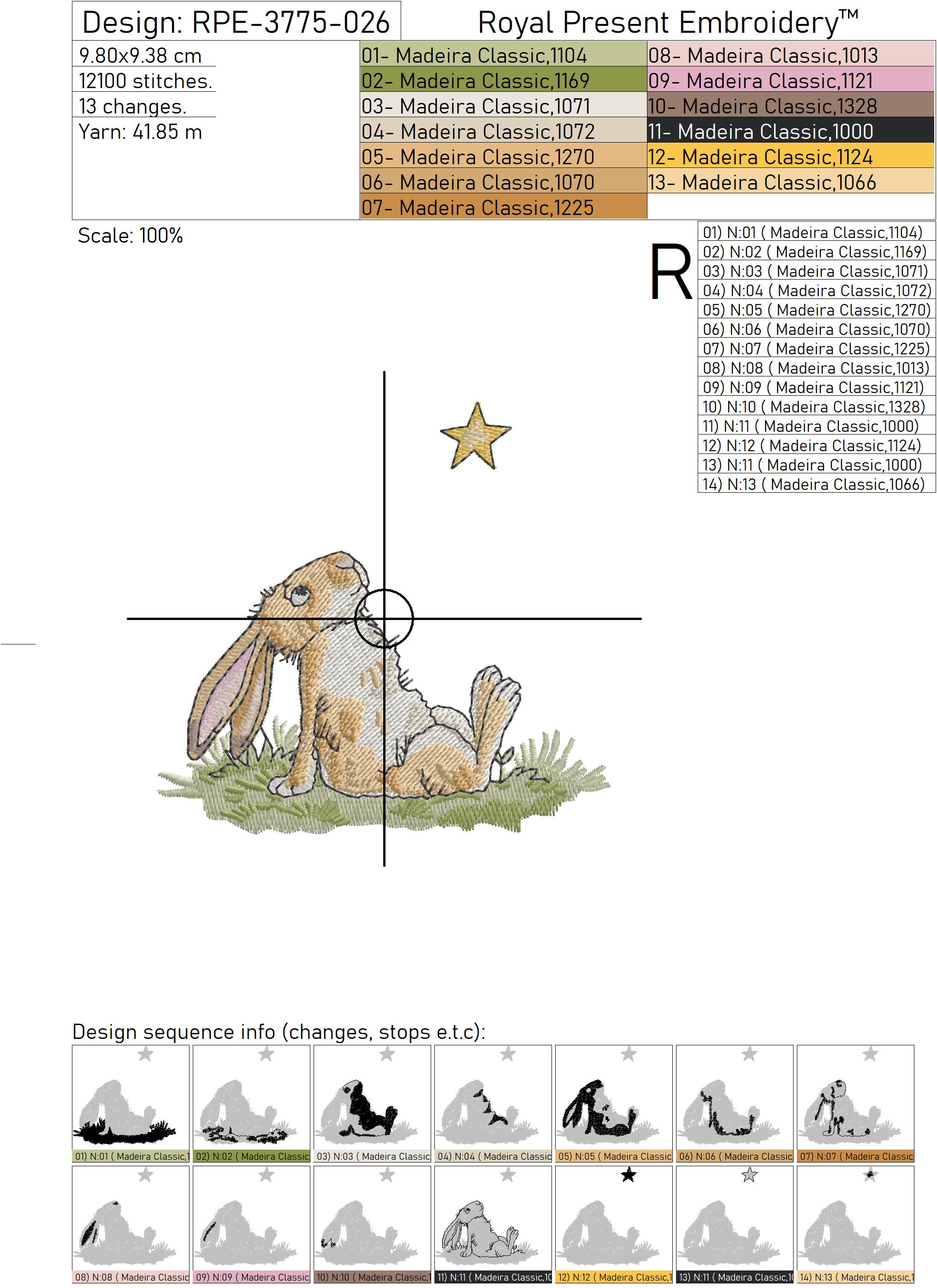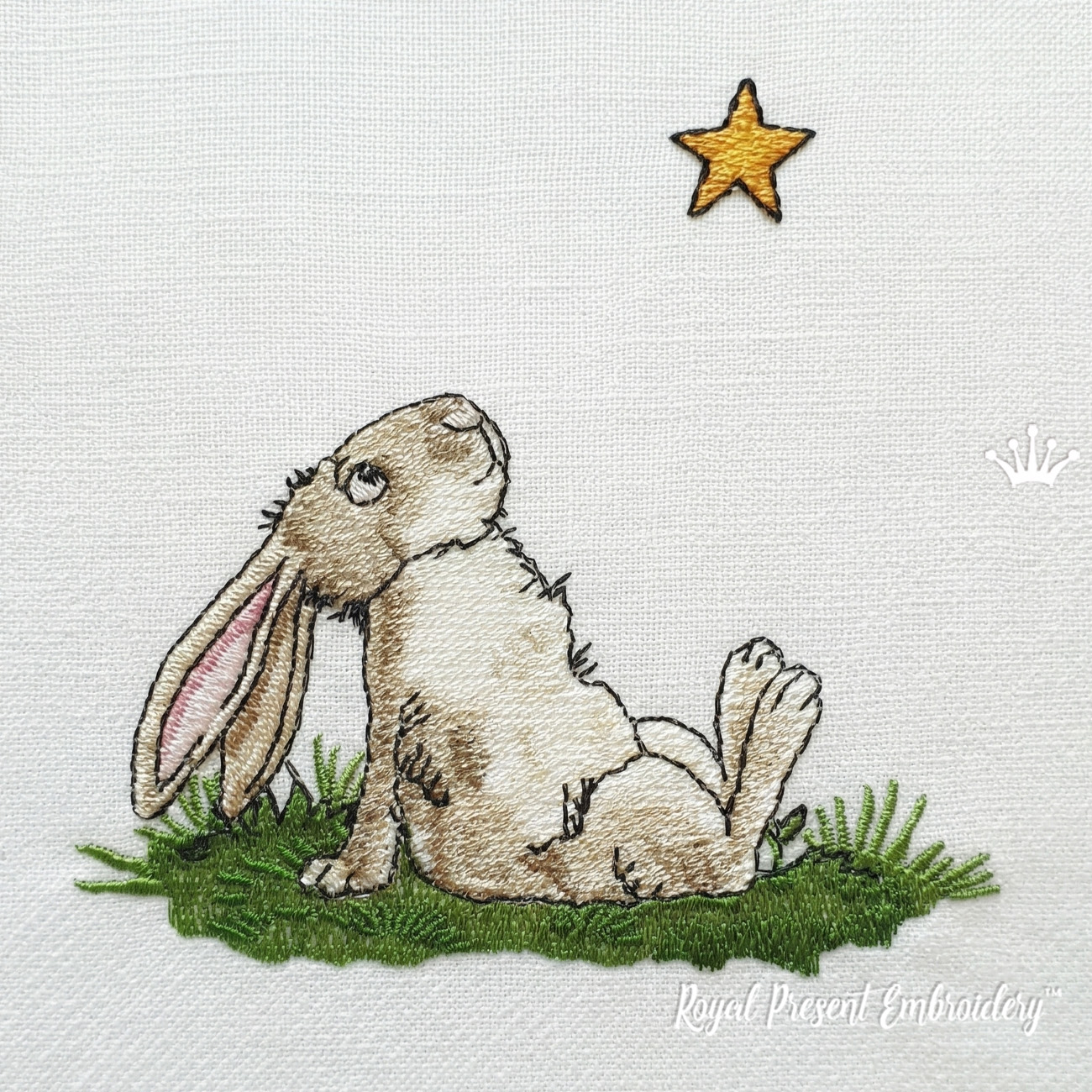 Apportez de la douceur et des histoires à vos projets avec cet adorable motif de broderie machine Dreaming Bunny Looking at a Star (Lapin rêveur regardant une étoile). Ce charmant lapin, paisiblement assis dans l'herbe et contemplant une petite étoile dorée, crée une scène magique et réconfortante, parfaite pour des créations douillettes et pleines de sens.