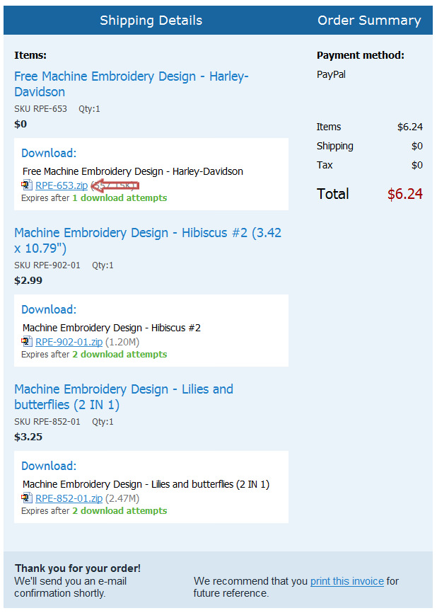 ~ Si vous n'avez pas reçu le design que vous avez commandé, connectez-vous à votre compte personnel et téléchargez le fichier à partir de là.