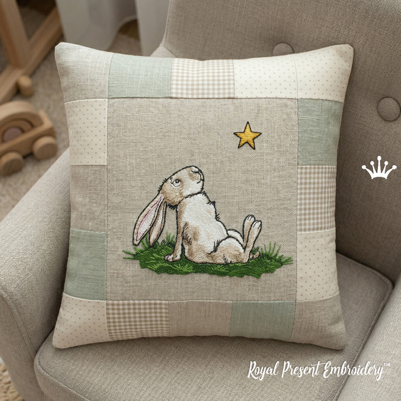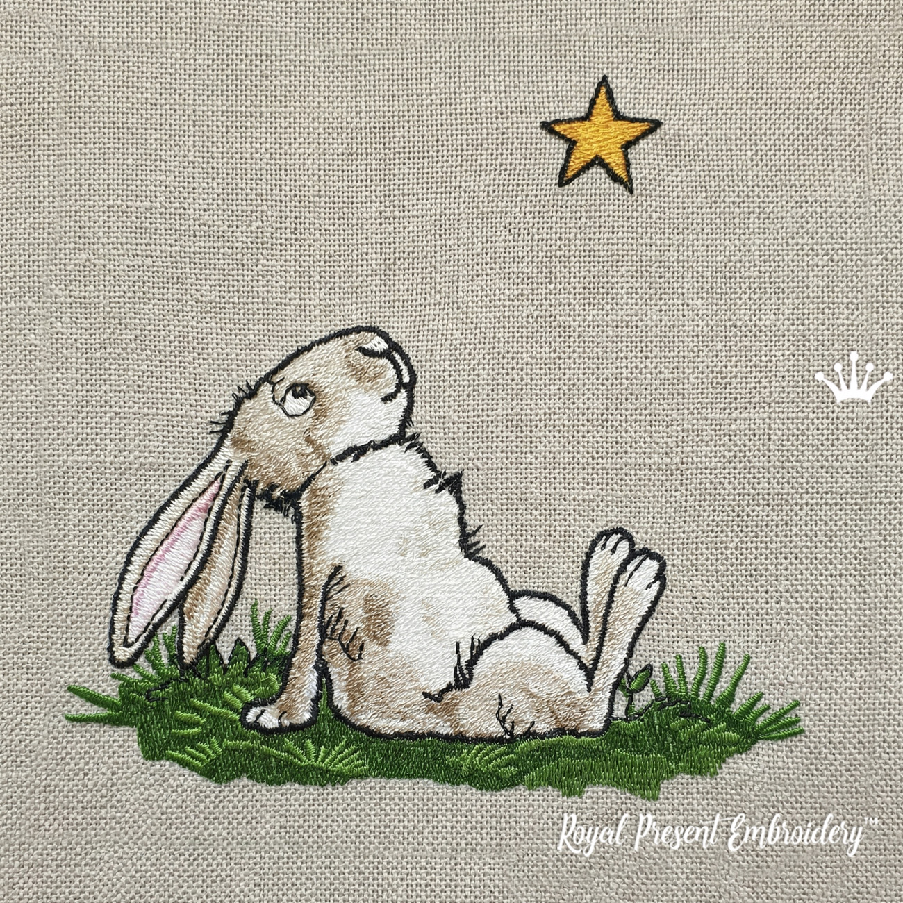 Apportez de la douceur et des histoires à vos projets avec cet adorable motif de broderie machine Dreaming Bunny Looking at a Star (Lapin rêveur regardant une étoile). Ce charmant lapin, paisiblement assis dans l'herbe et contemplant une petite étoile dorée, crée une scène magique et réconfortante, parfaite pour des créations douillettes et pleines de sens.