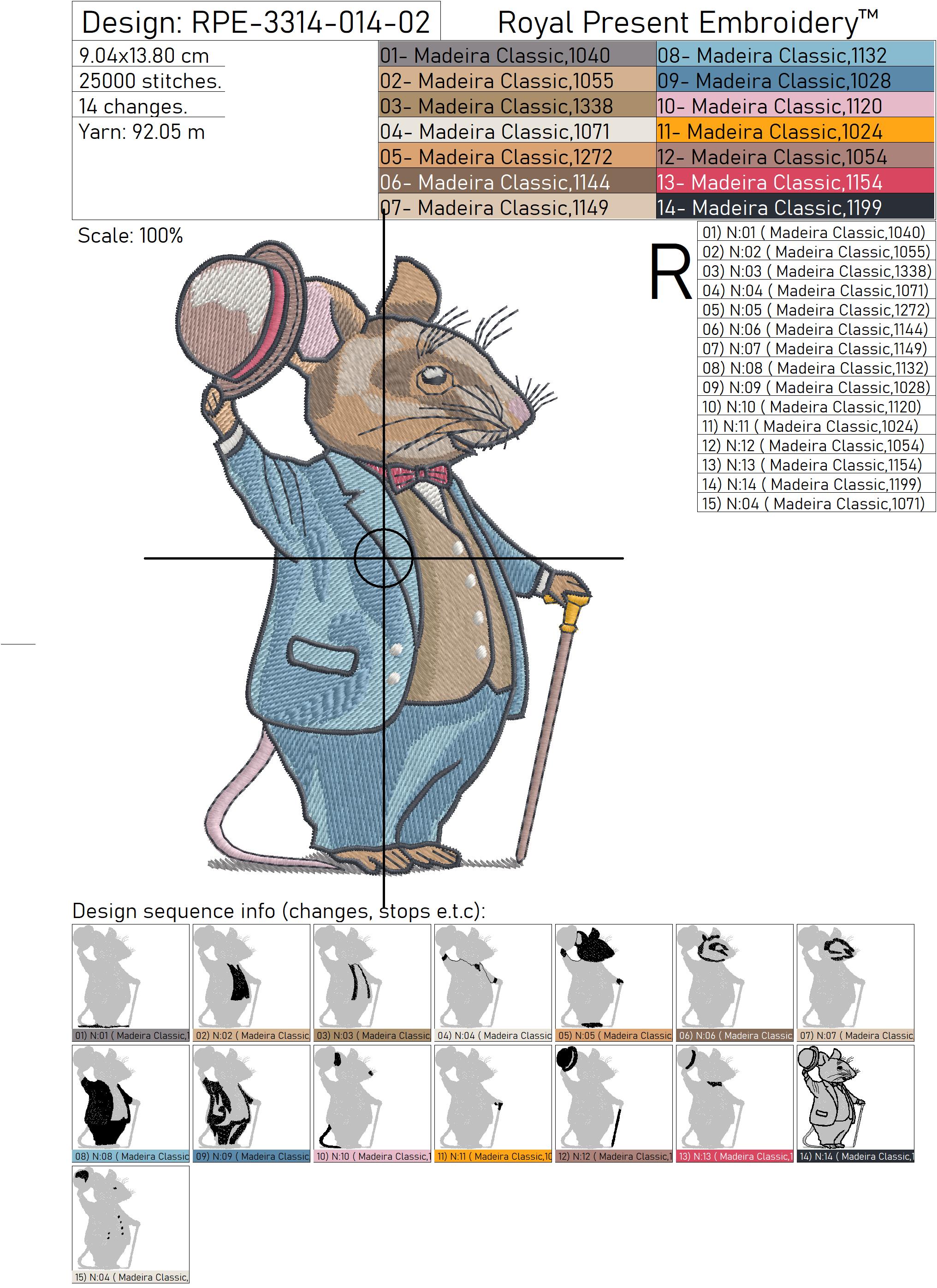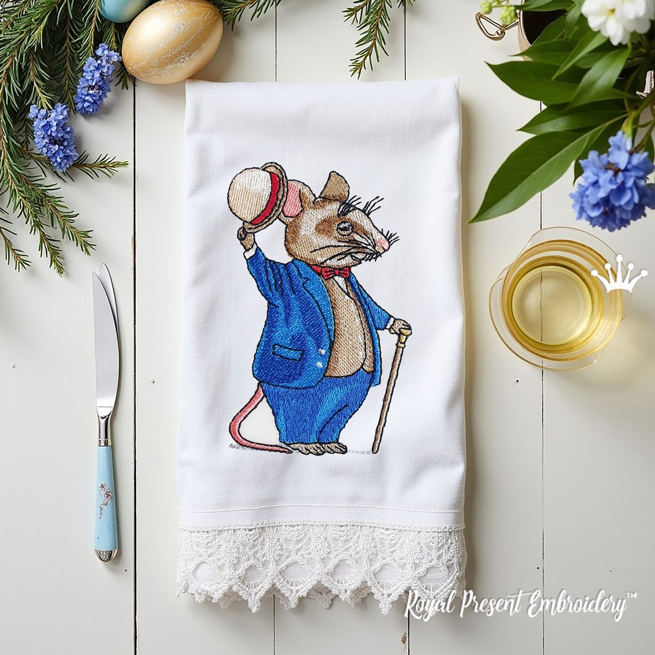 The Mr. Mouse in Tailcoat machine embroidery design adds a refined, whimsical touch to festive projects. With his top hat and formal coat, this charming mouse is perfect for decorating kitchen towels, linen aprons, and holiday gift items. Designed for a 100x170 mm (approximately 4x6.7 inch) hoop, it's ideal for medium-sized embroidery surfaces. Every stitch adds elegance and personality to your seasonal decor.