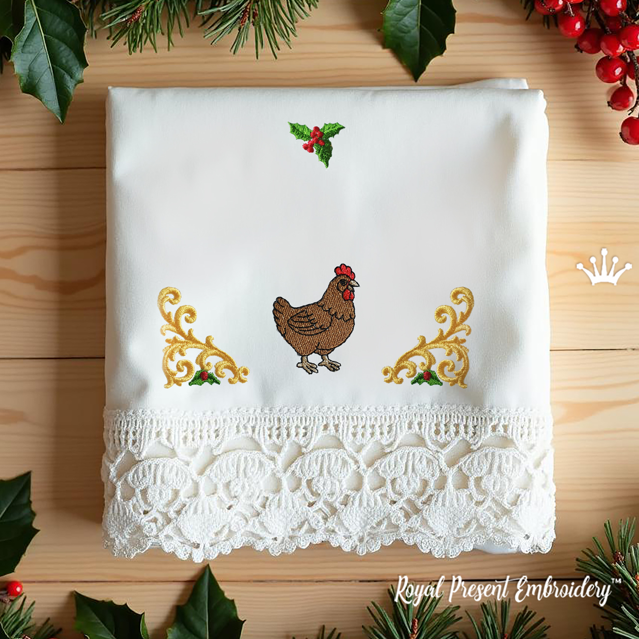 The Tiny Baroque French Hens Set is a charming collection of miniature machine embroidery designs made for festive textiles. Each stitch carries detail and elegance, making them perfect for holiday linens, table accents, and especially kitchen towels.